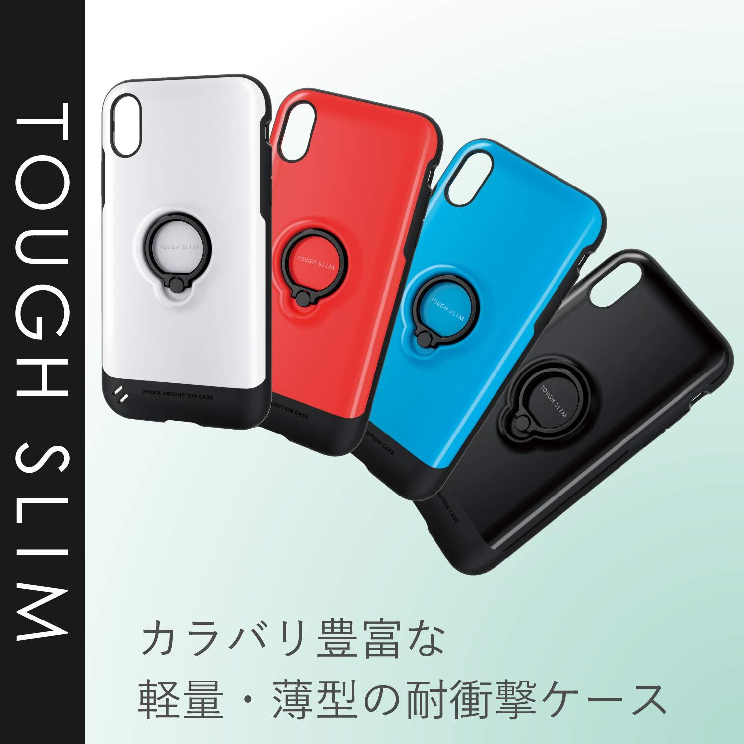■便利なフィンガーリング付きで、独自設計のエアクッションが効率的に衝撃を吸収する、薄くて軽い耐衝撃ケースiPhone XR用TOUGH SLIM/リング付です。 ■カバー背面に、持ちやすく、iPhoneの落下を防止するフィンガーリングが付いています。 ■フィンガーリングは使用しないときはスリムに納まるので、邪魔になりません。 ■iPhoneを片手で持っていても、フィンガーリングに指を通すことでしっかりと持つことができます。