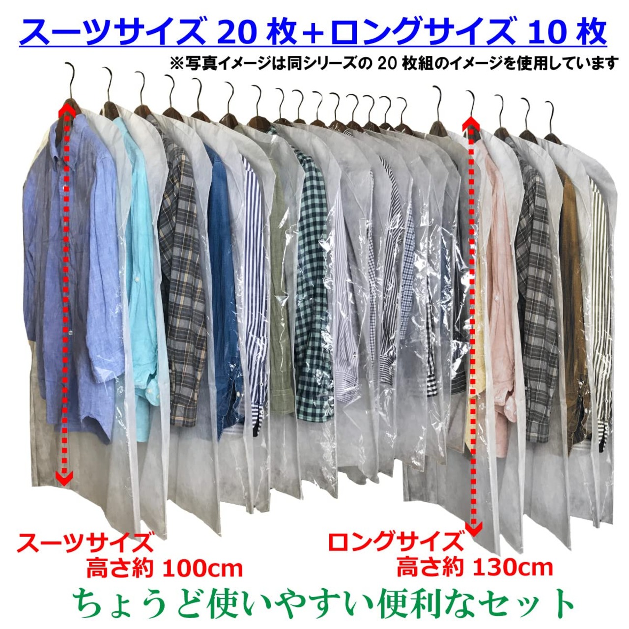 衣類カバー 日本製 30枚組 洋服 不織布 カバー 透明 通常20枚+ロング10枚 クリアタイプ 前面はハッキリ見えるクリア素材 背面は通気性の良い不織布素材 大切な衣類を安心保管