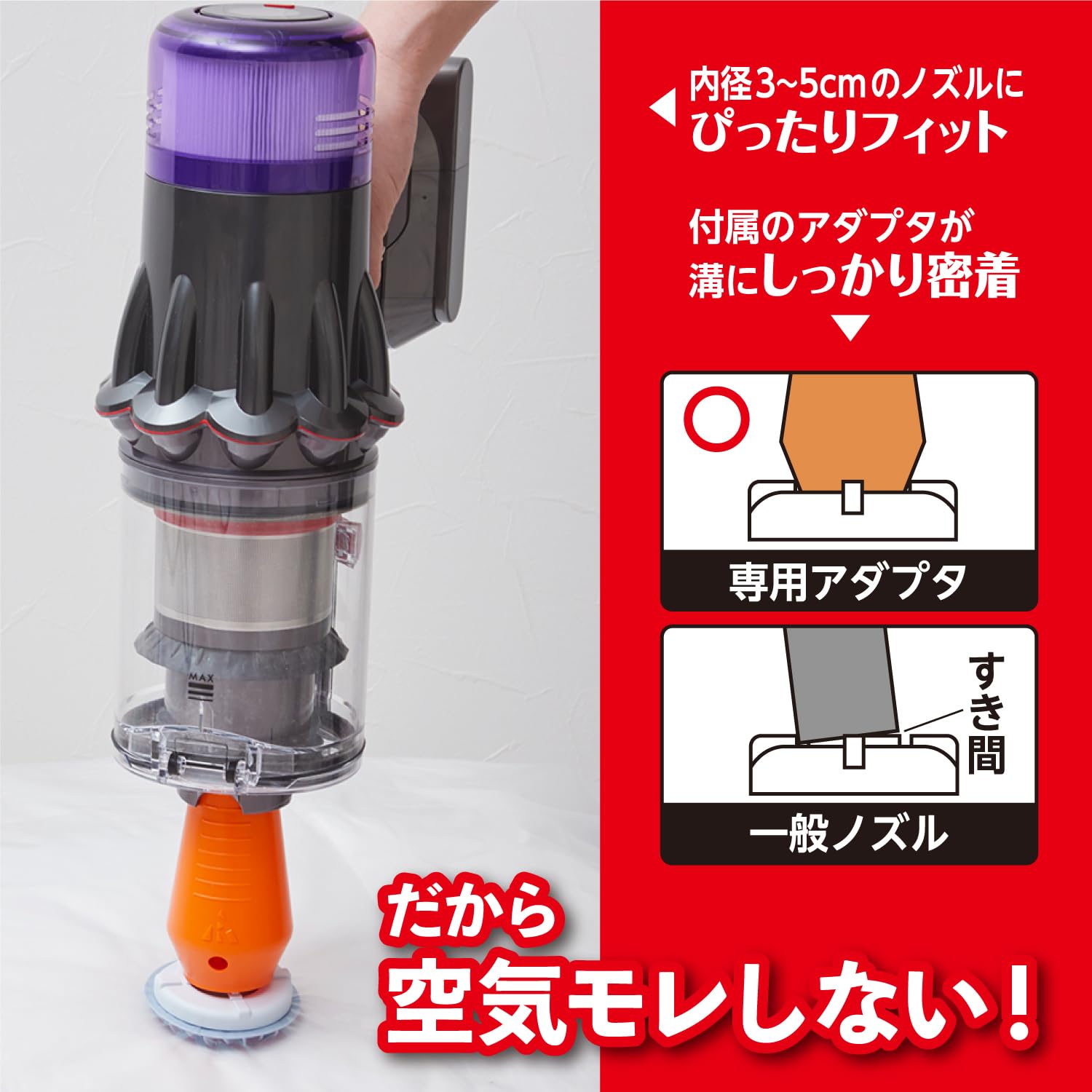 ・スピード圧縮できるアダプタ付き 空気をしっかり吸引できるバルブにピッタリサイズのアダプタを開発