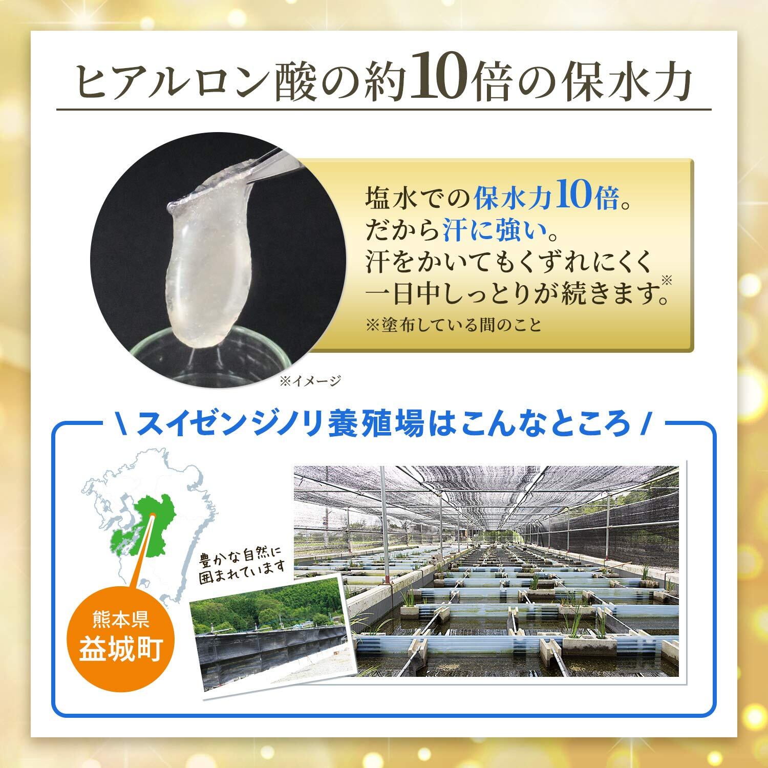 【うるおい続ける保水力】塩水でヒアルロン酸の約10倍もの保水力を誇る、熊本県産の希少なスイゼンジノリが、お肌のすみずみを濃密なうるおいで満たします。