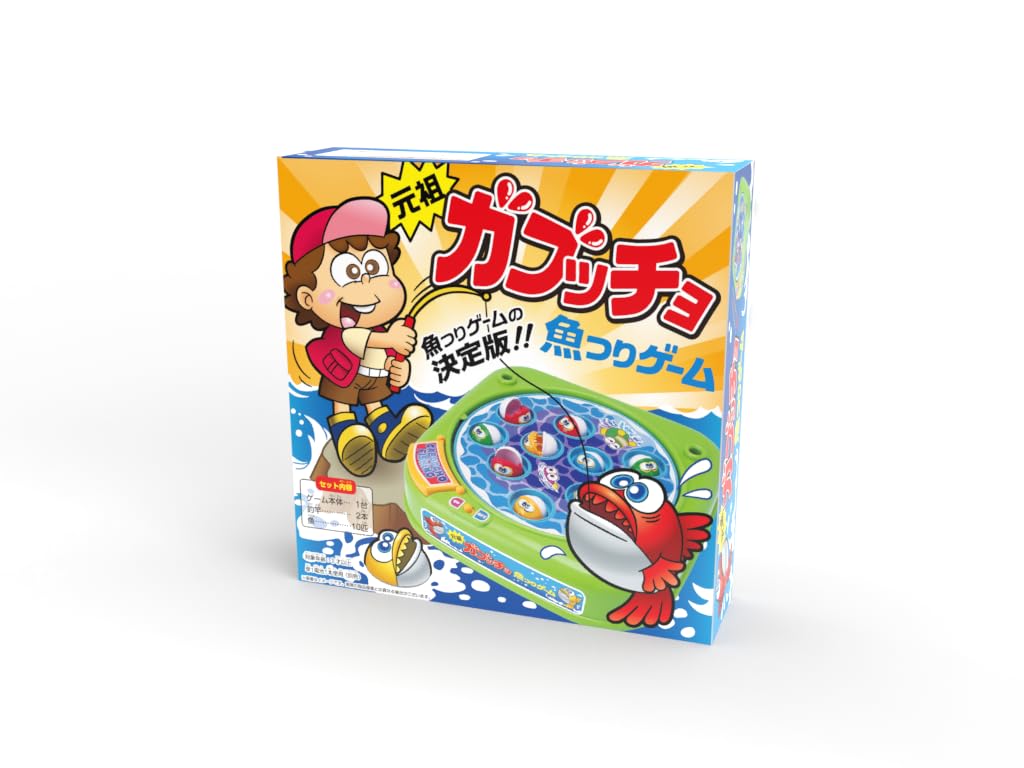 オイラはガブッチョ! 腹ペコガブッチョ! 美味しいごちそう食べたいな! 口をパクパク、なまいきガブッチョをつりあげろ! ! 家族みんなで盛り上がれる魚釣りゲームです。<あそび方> 1.本体の円盤の穴に魚をセットしてください。 2.本体のスイッチをONの位置にスライドさせると、円盤が回転して魚が口をパクパク開きます。 3.釣竿で魚を釣りあげて、たくさん釣った人が勝ちです。