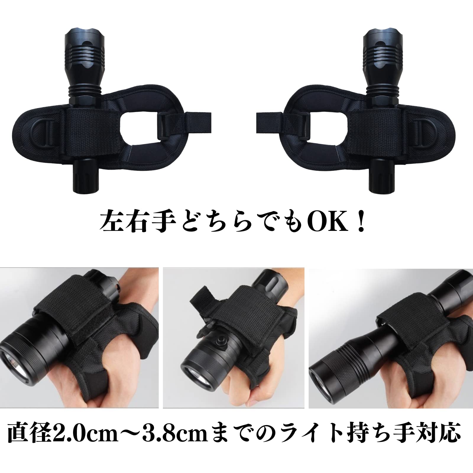 【対応するライト】直径2.0cmから3.8cmまでのライト持ち手に対応できます。(マジックテープで装着するライトの太さにより調節可能です。)