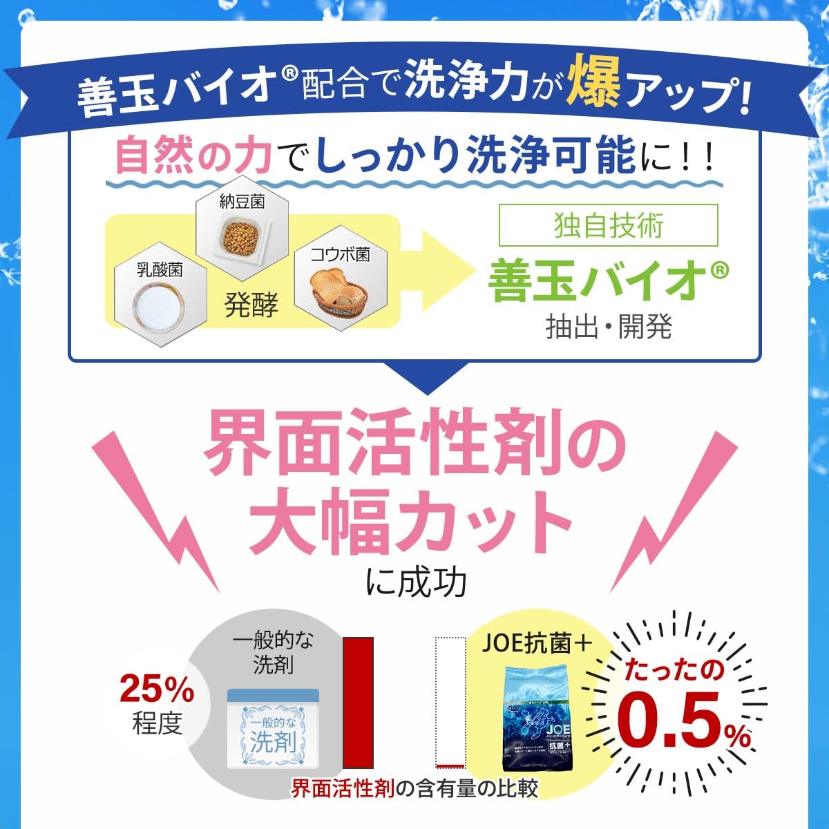 【善玉バイオを配合】独自製法により「乳酸菌」「酵母菌」「納豆菌」などを発酵抽出した「善玉バイオ」を洗濯洗剤に配合。 自然の力で洗浄力をバックアップしています。