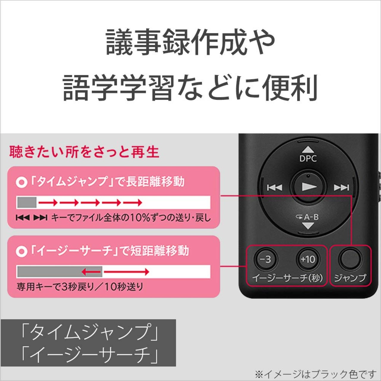 長時間録音したファイルの聞きたいところを素早く見つけるのに便利な「タイムジャンプ」、ボタンひとつで早送り(+10秒)/早戻し(-3秒)が可能「イージーサーチ」、小さく録音されてしまった場合も、録音ファイルの最大音量箇所が音割れしない範囲まで全体的に音量レベルを上げる「ノーマライズ」機能搭載