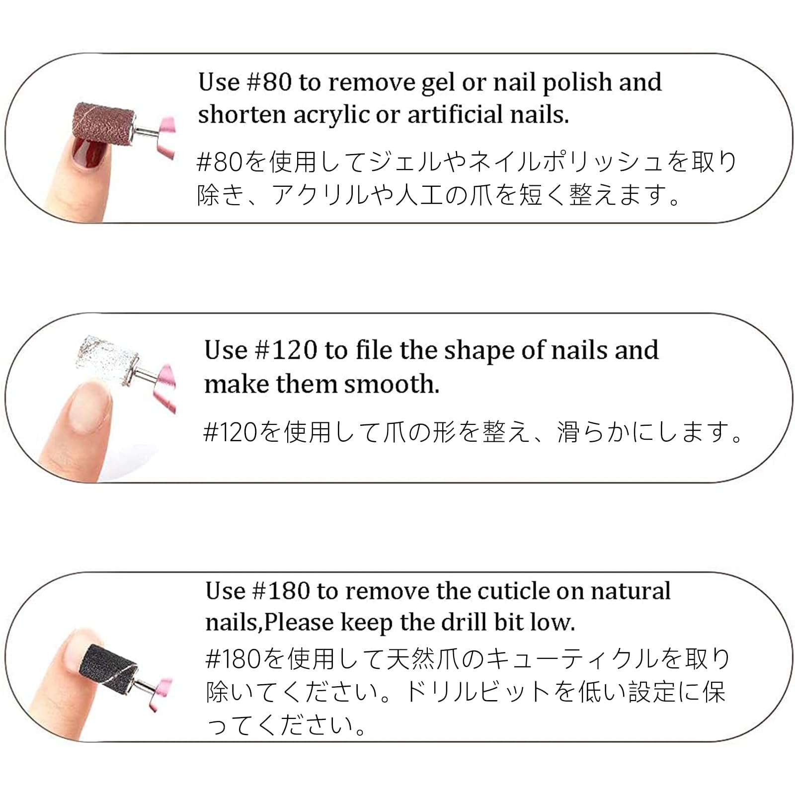 使用方法:ドリルビットの上にマニキュアサンディングバンドを挿入すると、ネイルアートの準備ができます; 80#を使用してゲルまたはマニキュアを取り除きます。アクリルまたは人工ネイルを短くするためにも適用できます; 120#爪を整えることができます、形と滑らかさ;それから180#で自然な爪のキューティクルを取り除きます、低速でネイルドリルを維持してください。
