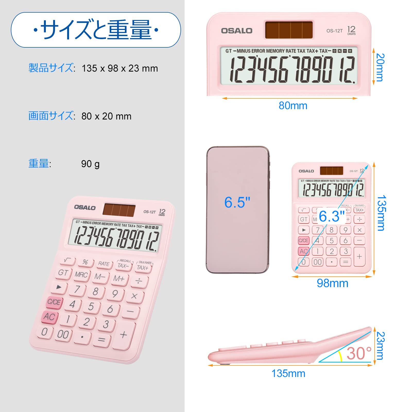 卓上電卓 大型LCDディスプレイ 12桁 数字ビッグボタン 税金会計計算機 電池式 太陽光発電 デスク オフィス 自宅 ビジネス用 (OS-12T ピンク)