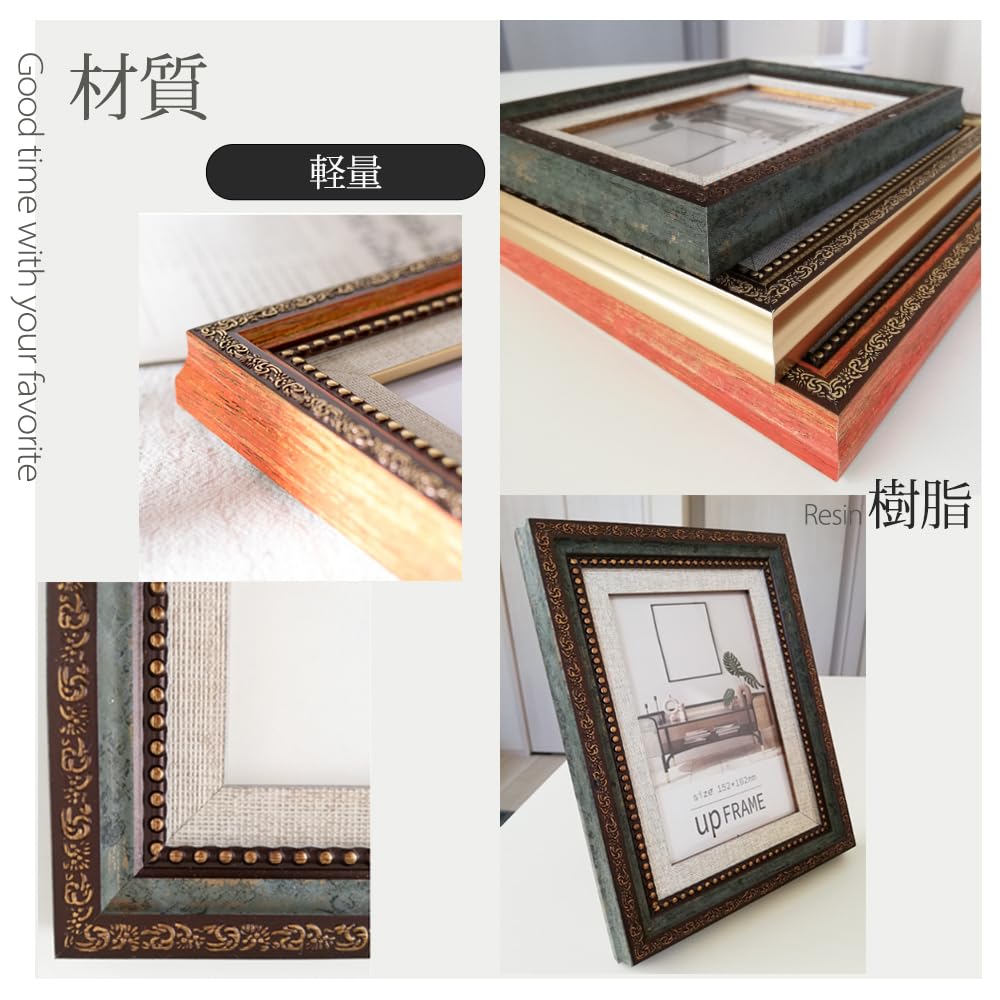 アンティーク風 写真立て おしゃれ フォトフレーム 額縁 御洒落 樹脂製 置き掛け兼用 レトロ アンティーク ヴィンテージ 壁掛け 卓上 縦横兼用 額縁 (写真L版 Green)