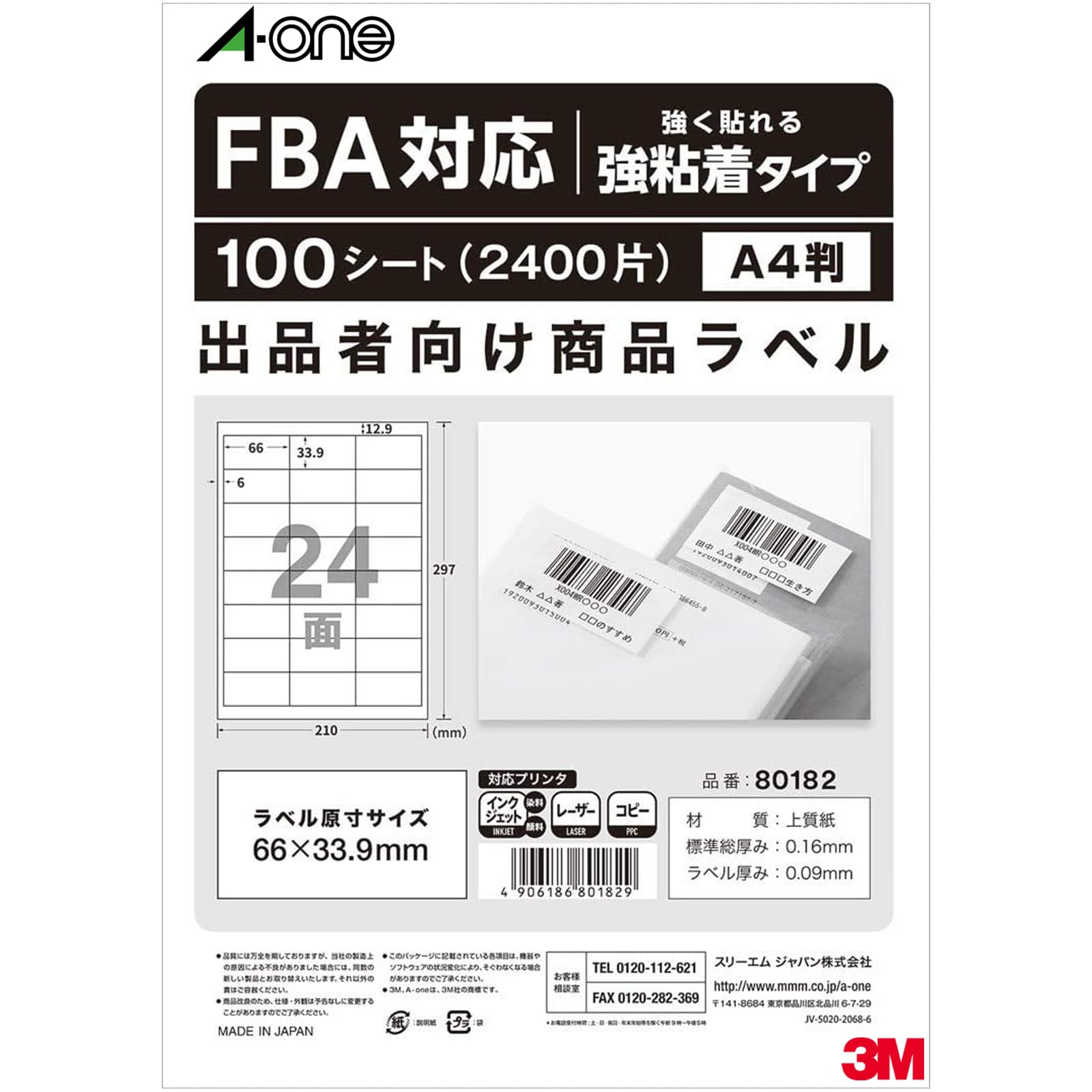 【FBA対応】 エーワン ラベルシール 出品者向け 商品 ラベル 用紙 強粘着 24面 100シート 80182
