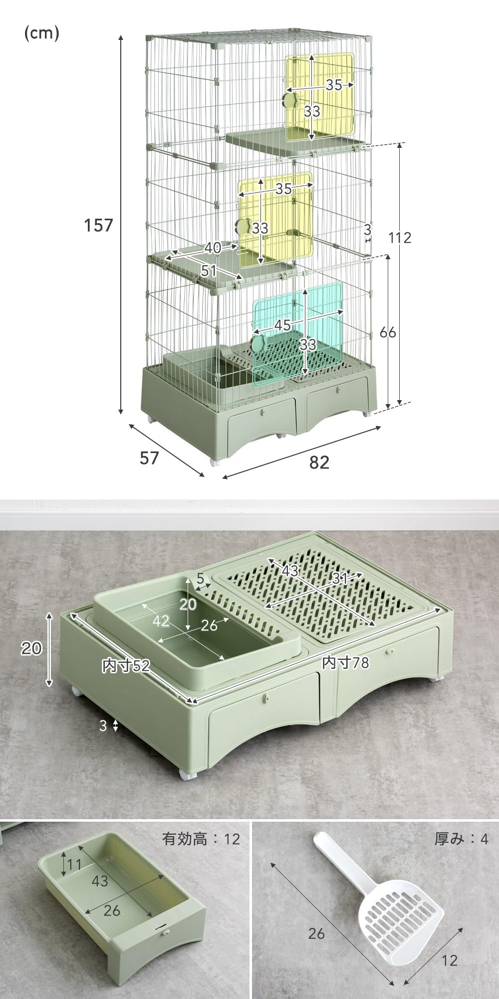 タンスのゲン 猫ゲージ 3段 幅67㎝ 高さ157㎝ トイレ付き キャスター付 丸洗いOK キャットケージ 引き出し 収納 52800019(90280)