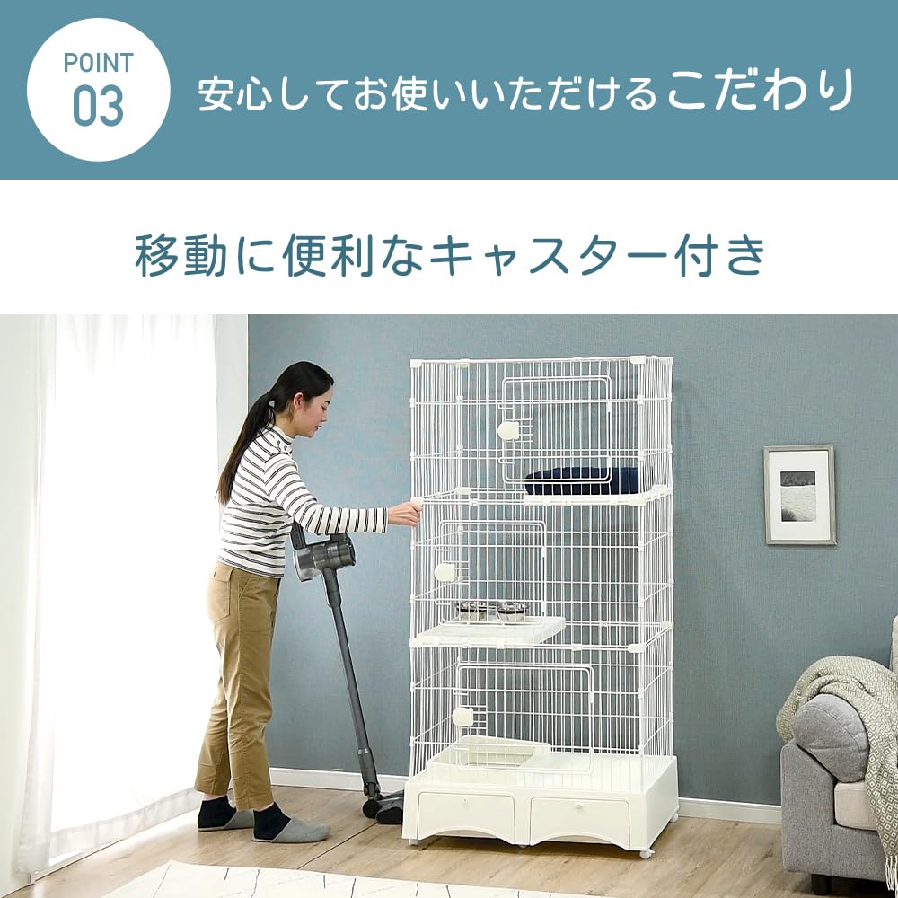 【スタッフのおすすめポイント】 ・ケージとトイレが一度に揃う! トイレ一体型キャットケージ ・扉を閉めたまま砂替え/お掃除OK ・ガード付きで砂飛びしにくい ・すっきり片付く引き出し収納 ・ベッドも置けるワイドステップ台 ・お世話しやすい3ドア+フルオープン天井 ・成長に合わせて選べる段数 ・移動に便利なキャスター付き ・おしゃれなワントーンデザイン