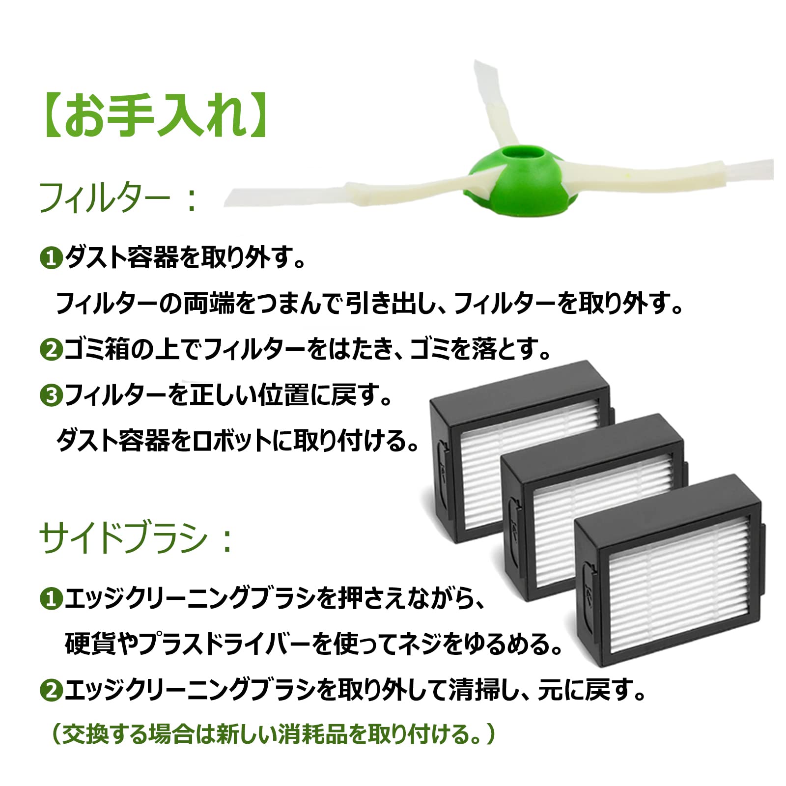 【パッケージ内容】ダストカットフィルター×4、回転ブラシ×2対、サイドブラシ×6