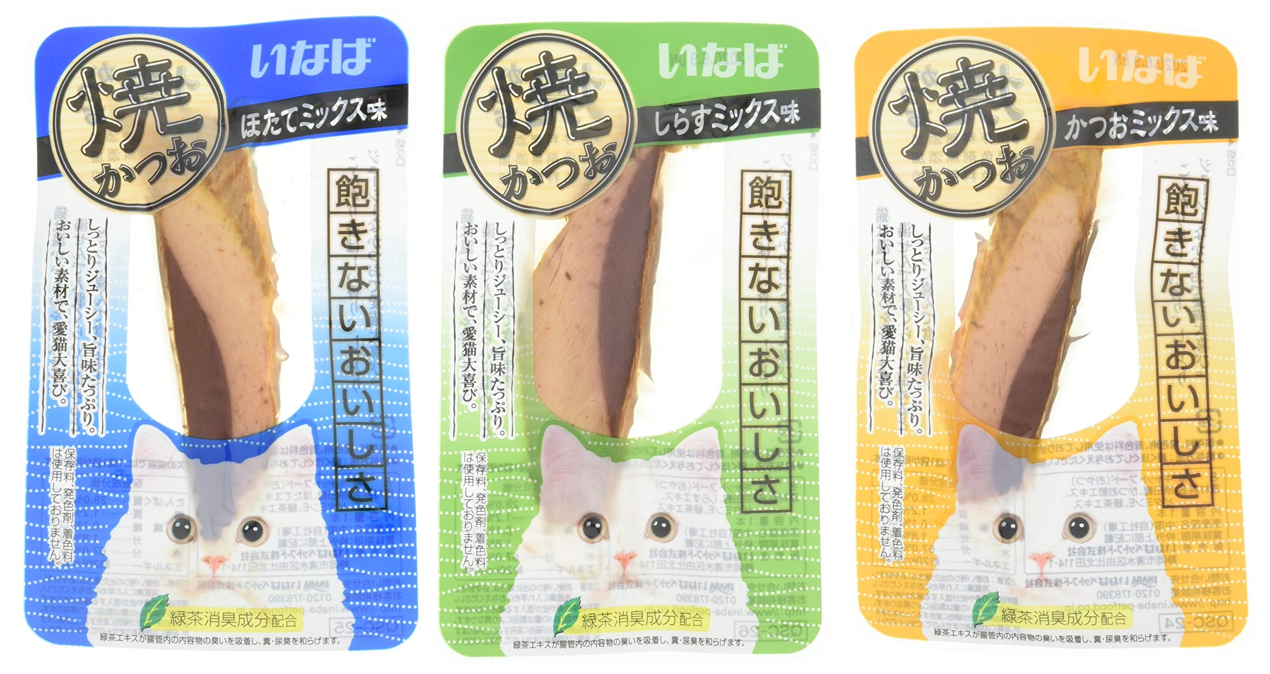 【かつおミックス味】宗田鰹、かつお節エキス、ビタミンE、緑茶エキス 【ほたてミックス味】宗田鰹、ほたてエキス、ビタミンE、緑茶エキス 【しらすミックス味】宗田鰹、しらすエキス、ビタミンE、緑茶エキス