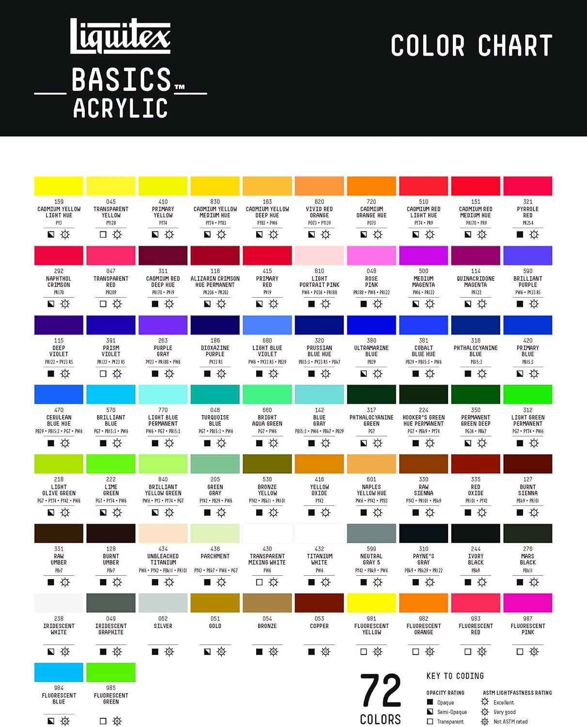 適度な練り具合のベーシックス絵具には、アーティストクオリティの耐光性顔料を配合し、118mlチューブ全72色、400mlボトル全20色の多彩なカラーバリエーションが揃っています。