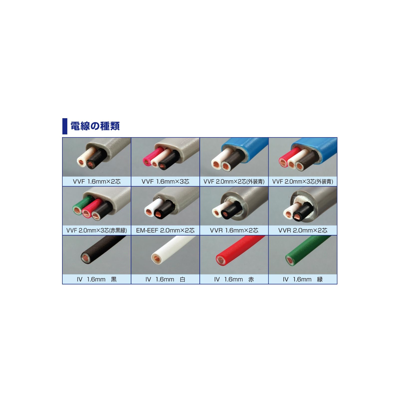 VVF2.0mm電線には青色外装を採用し、視認性を向上。