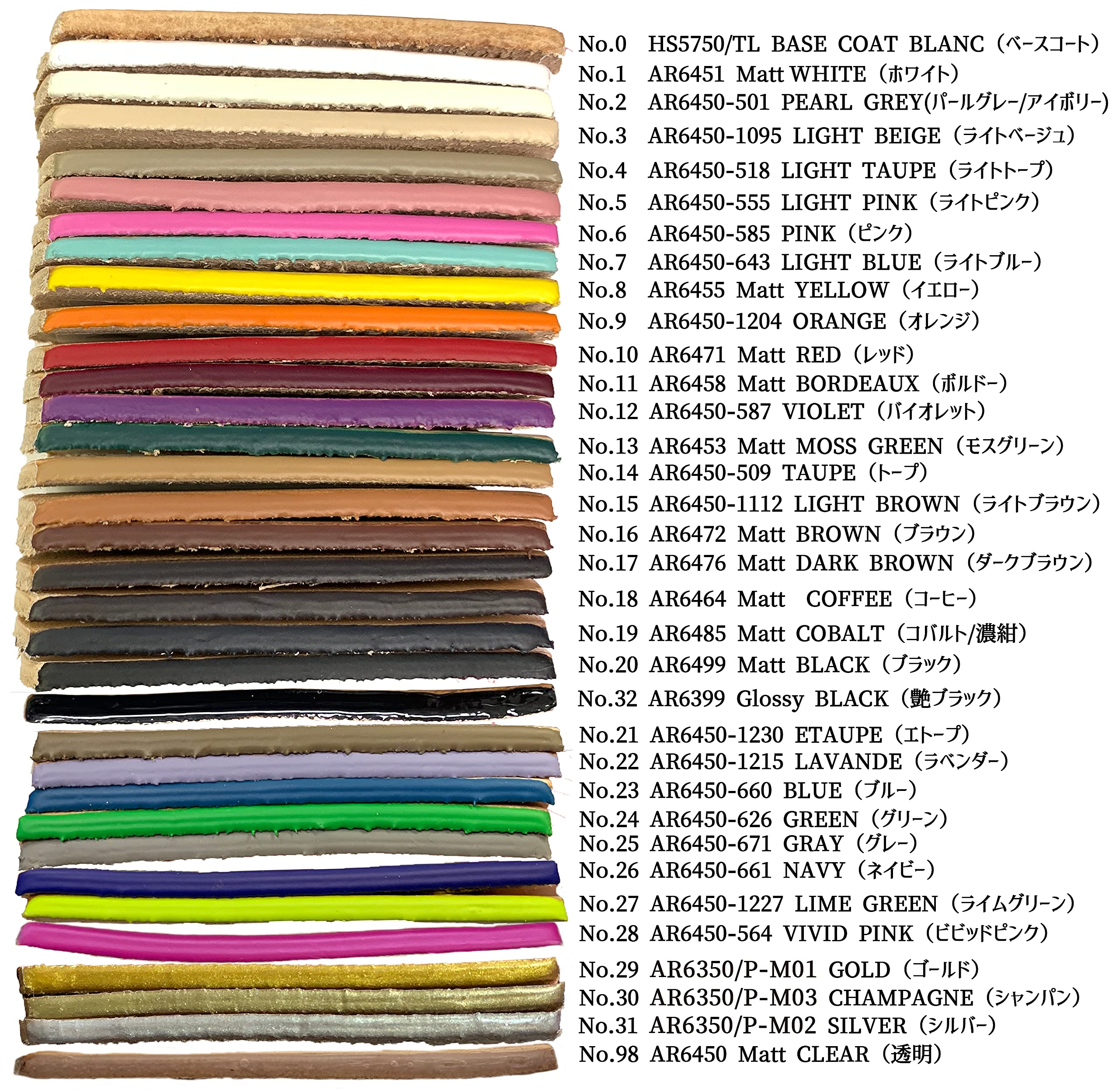 数多くのハイブランドの革製品に使われ、革の雰囲気を損なわない上品な仕上げと強いカバー力が特徴。乾くとゴムのような柔軟性を持つため折り曲げにも強く、タンニン、クロム、コンビ、様々な革に使用可能。混色調色することで好みの色を作り出すこともOK。