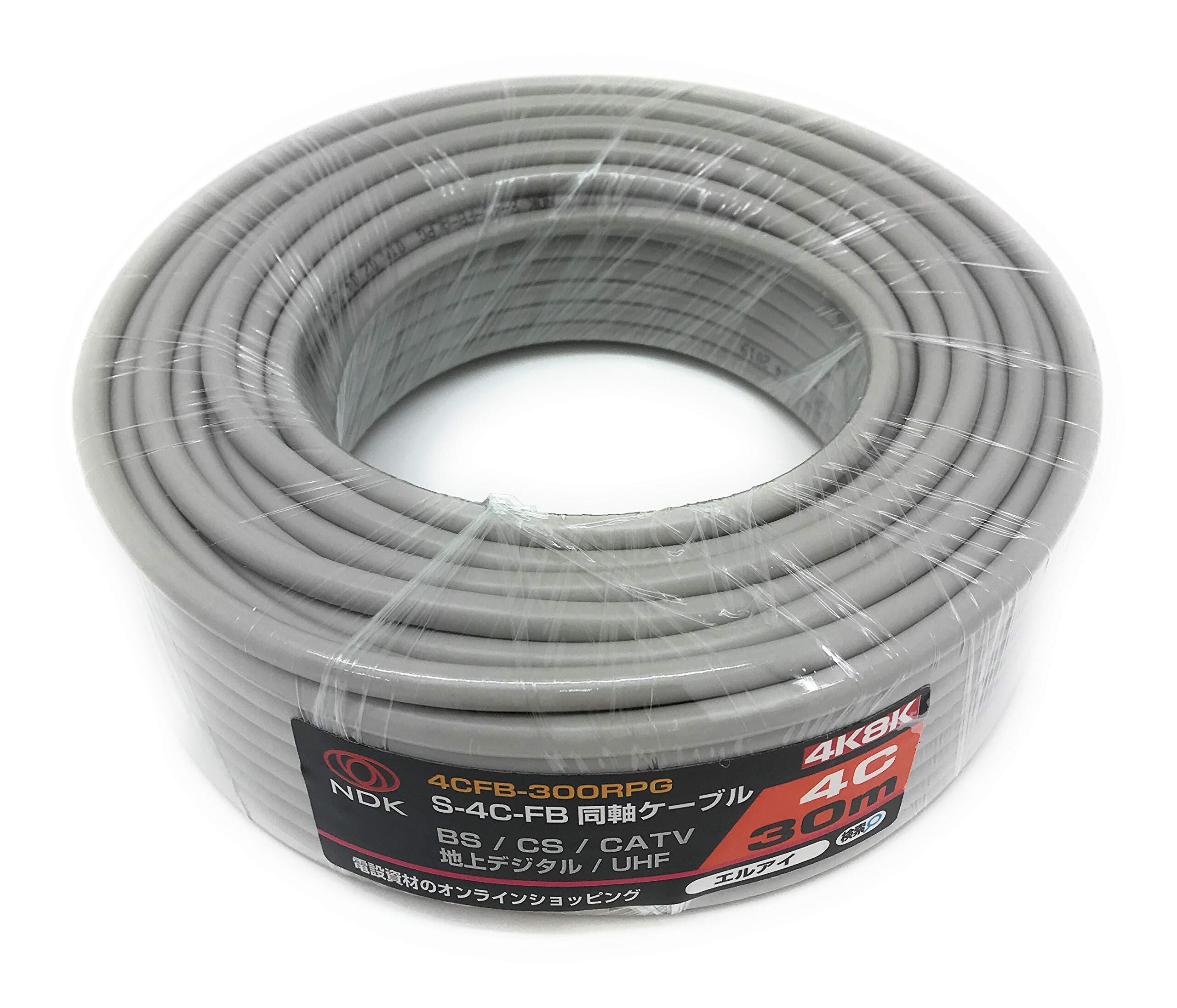 【商品仕様】▼カラー:薄灰▼長さ:30m▼ケーブル規格:S-4C-FB (両端未加工)▼インピーダンス:75Ω▼ケーブルの太さ (外被):7.7mm▼ケーブル芯線:銅▼対応規格:UHF・CATV・BS・CS・2K、4K、8K (~3224MHz)