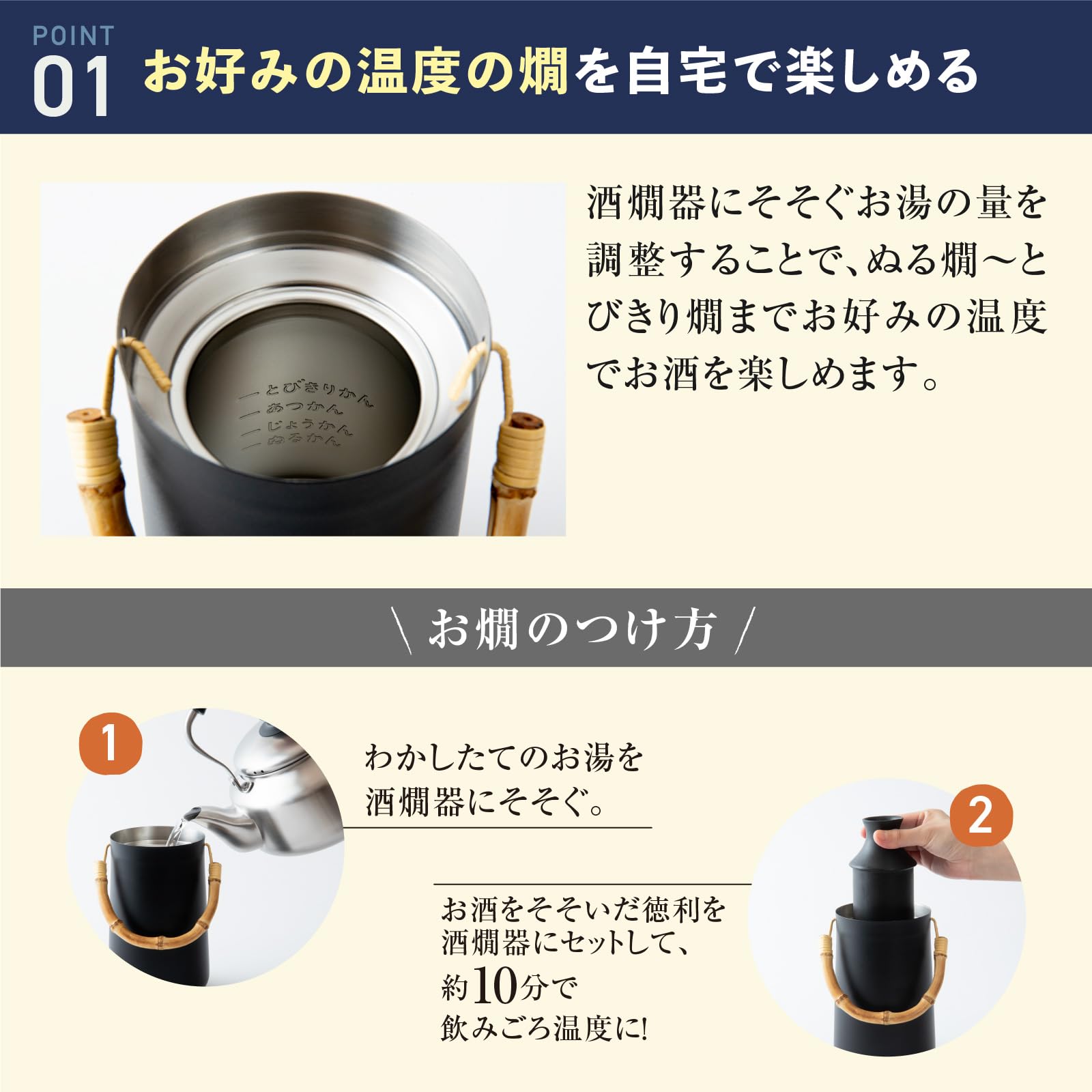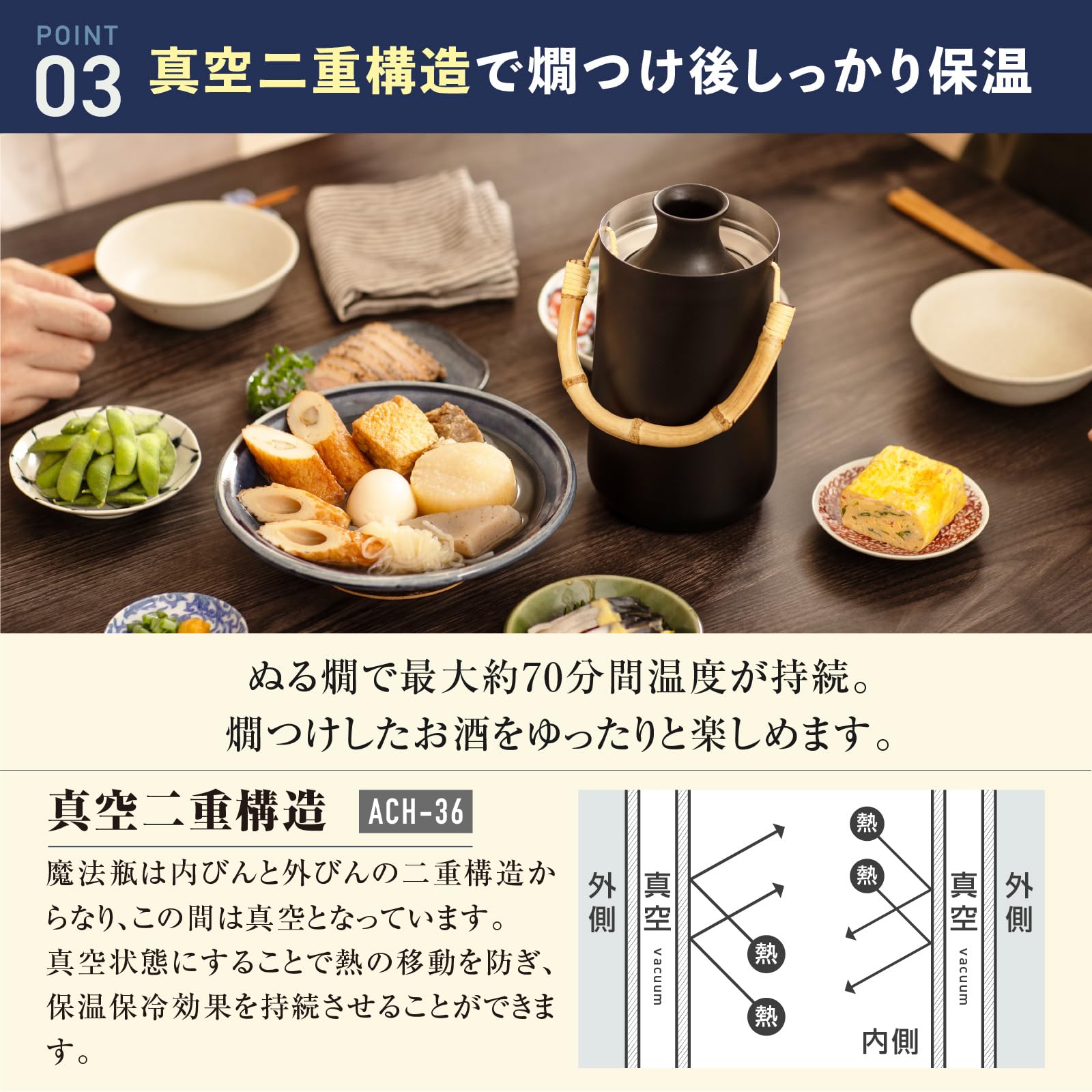 湯せん式で旨さを逃がさずじっくり過熱できます。●ぬる燗からとびきり燗までの温度調節ができます。●ご自宅で気軽に本格的な燗酒が愉しめる。●魔法瓶構造による優れた保温性。