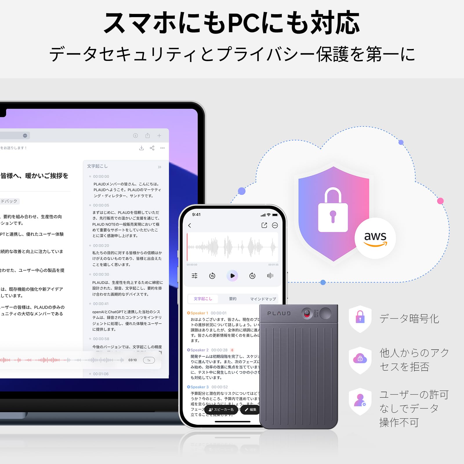 【プライバシー保護を第一に】PLAUDは、ユーザーのデータセキュリティとプライバシー保護を最優先にしています。データの保存、削除、転送を含むすべての操作は、ユーザーの許可なしには一切行われません。録音、文字起こしや要約データは暗号化されたポートを通じてChatGPT APIに接続され、AIモデルのトレーニングには使用されません。すべてのユーザーデータはAWSクラウドにマスキングされて保護されます。他者がアクセスすることはできません。*PLAUDは容量無制限のクラウド同期ストレージをご提供いたします。
