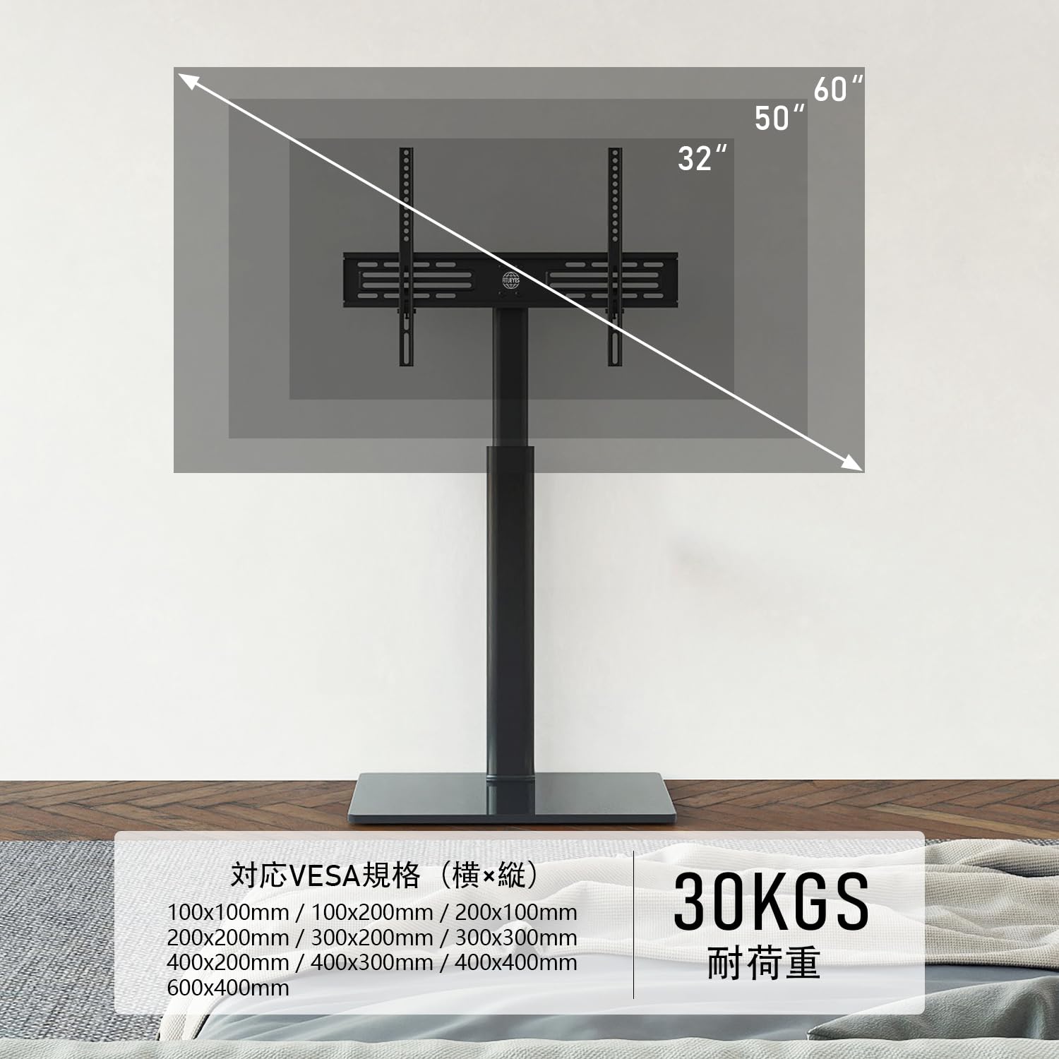 【VESA規格対応】汎用性の高いVESA規格(テレビ背面のネジ穴間の距離)対応、最小限は20×20cm、最大限は60×40cmです。当製品がほとんどの32~60インチのテレビやモニターに適応します。