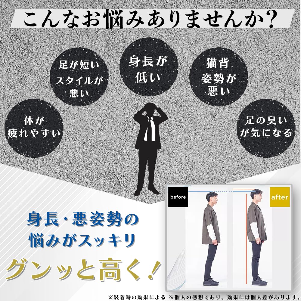 【商品基本仕様】理想の身長を実現する厚底インソール。「厚底ソール2.5cm」+「姿勢サポート」により、グンっと身長を高くします。3つの特許技術により、足元から体を整える効果が期待できます!