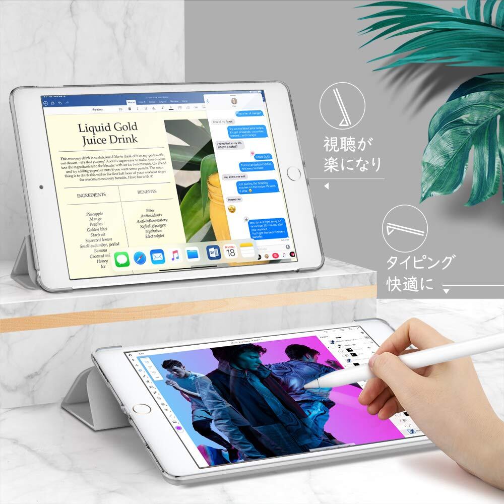 カバーを折れる仕様にデザインして、折巻きしてスタンドになれて、二つの置く角度調整できて、両手解放で動画観賞や、タイピング、ゲームなども快適にご利用頂けます。