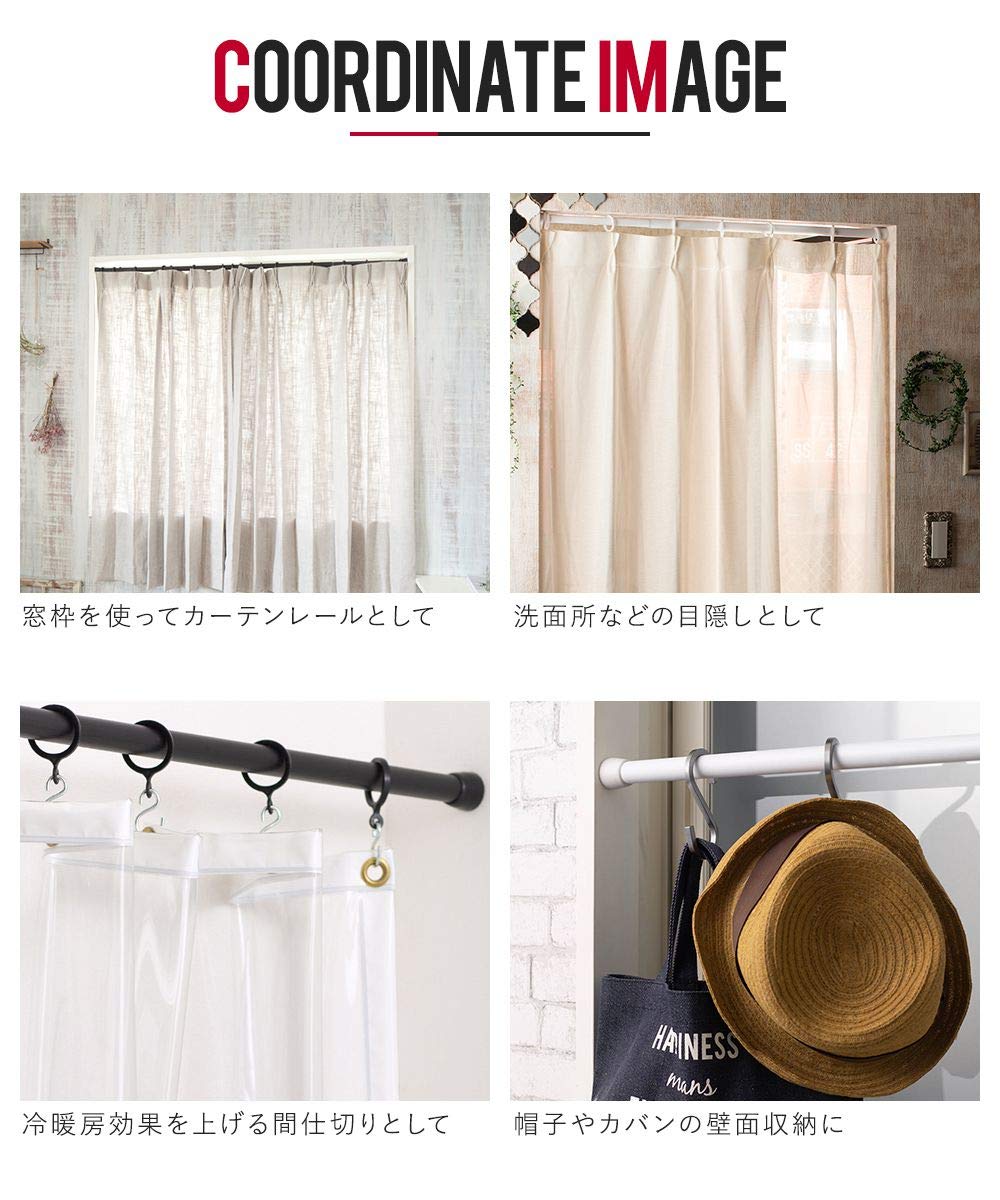 【取り付け簡単】ジョイント部分を回転させるだけで長さ調節が出来るシンプルな構造。ポールの端を片側の取付面に当て、ポール内部のバネを圧縮し突っ張るように取り付けます。女性でも簡単に取り付けることが出来ます。 【耐荷重は最大15kg】両端のグリップは凹凸のあるゴム製キャップでずり落ちにくい構造で厚手のドレープカーテンも大丈夫。薄手のビニールカーテンを吊るし間仕切りにすることで冷暖房効率アップし省エネに効果的です。