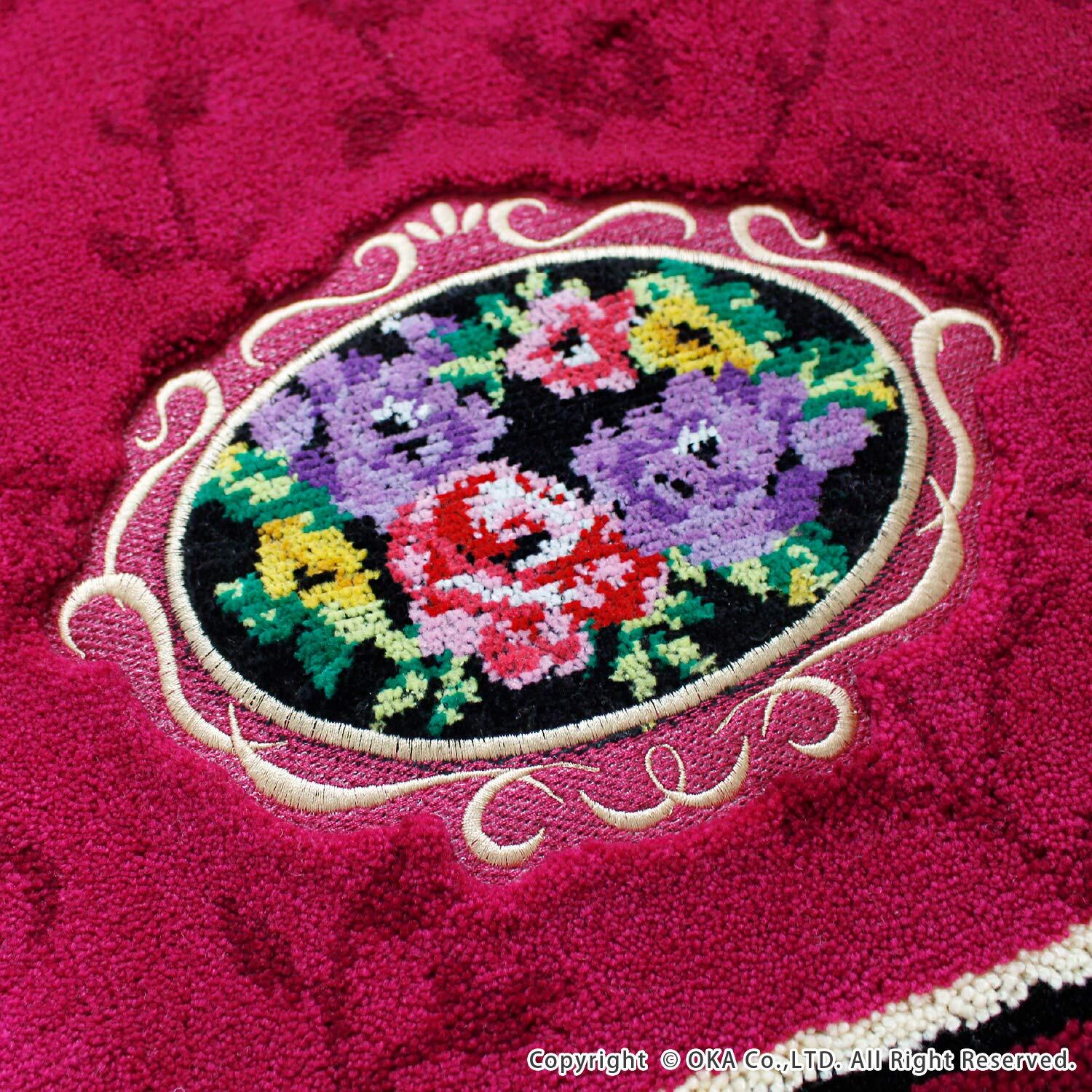 またこのシリーズの特徴のシェニール織りの刺繍が目を引きます。紋章のような刺繍でまわりを囲むことでより高級感を際立たせ、マットを広げた空間が華やかにそして明るく演出してくれます。すべりにくい加工を施しているのでどなたでも安心してご使用いただけます。