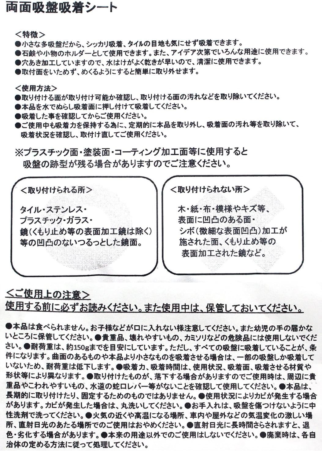 ※プラスチック面・塗装面・コーティング加工面に使用すると吸盤の跡が残る場合がありますのでご注意ください。