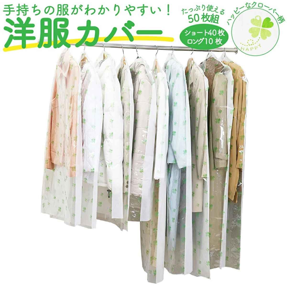 洋服カバー 不織布 クローバー柄 50枚セット (ショート40枚・ロング10枚) 日本製 片面不織布 片面ビニール 通気性 1枚ずつ取り出し可能 ティッシュ式 大容量 衣替え [(株)フォーラル]