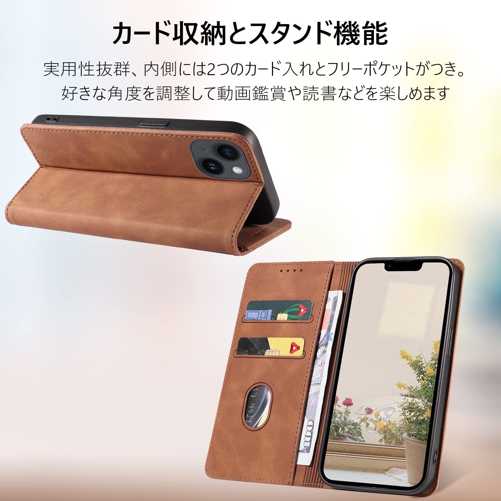 【カード収納とスタンド機能】アイフォン14 カバー動画視聴に便利なスタンド機能が付き、横向いて斜めに立てて、お好きな角度を調整でき、両手が解放され、お気軽に読書やビデオの観賞を楽しむことができます。内側には2つのカード入れとフリーポケットがつき、名刺や定期券の収納に優れているiPhone 14 用 カバーです。