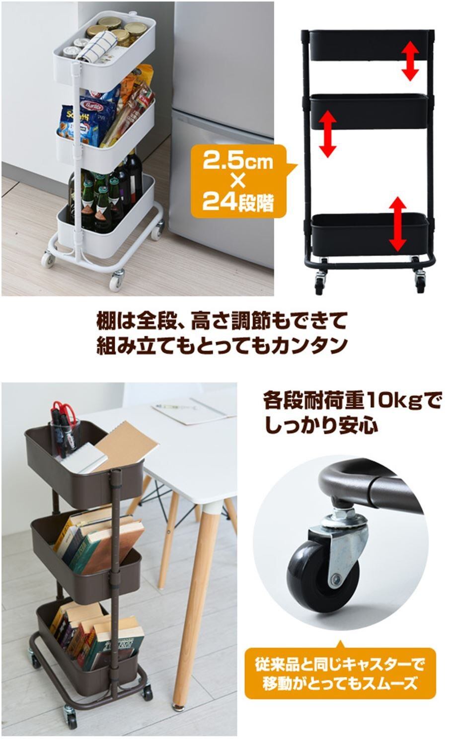 ●3つのバスケットはモノに合わせて、2.5cm間隔、24段階で高さを選んで設置可能