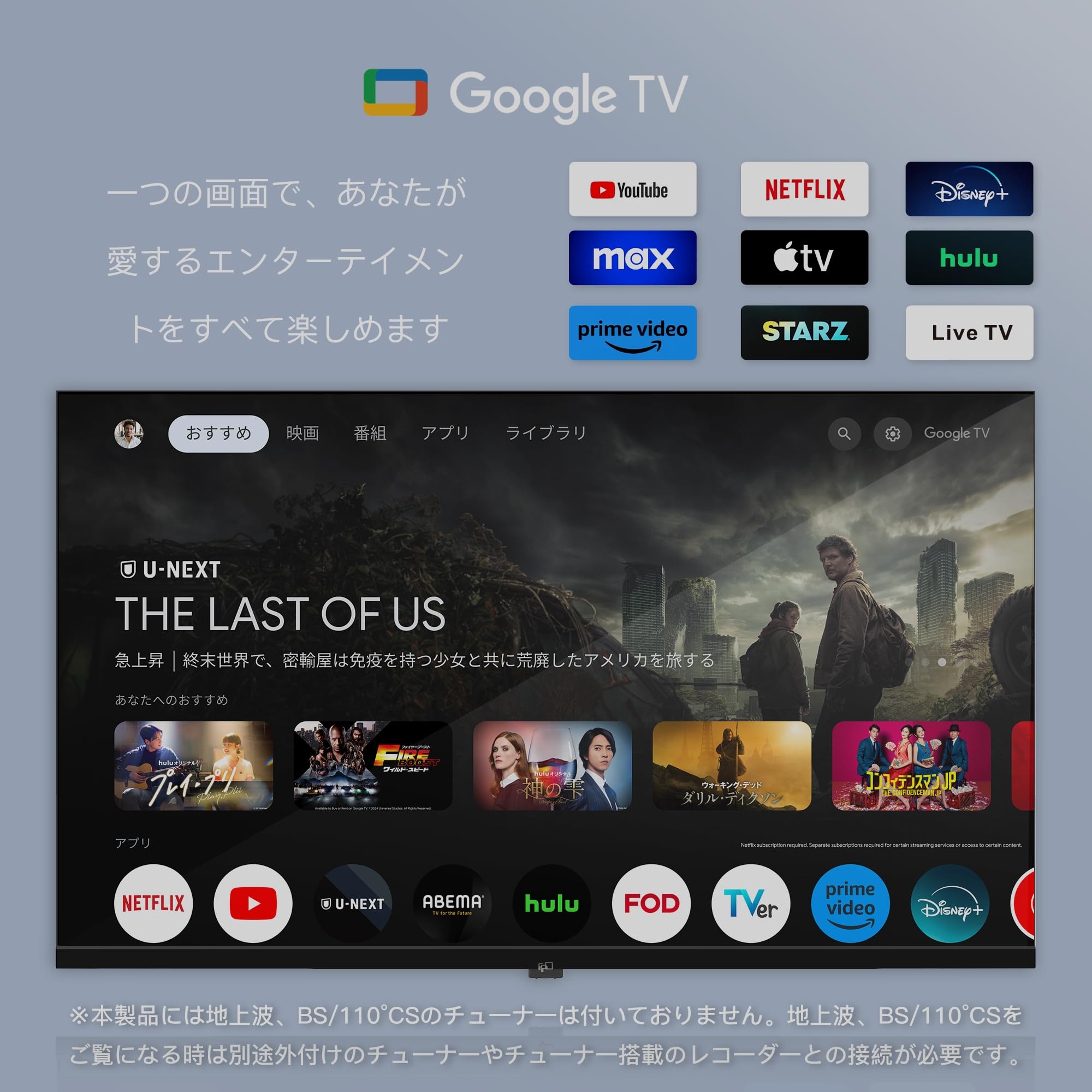 【Google OSを搭載】Google テレビ は包括的なエンターテイメント エクスペリエンスを提供し、ユーザーはさまざまなストリーミング サービス、アプリ、ライブ TV チャンネルに 1 か所でアクセスできます。 直感的なインターフェイスと音声コントロール機能により、お気に入りのコンテンツを簡単にナビゲートして見つけることができます。