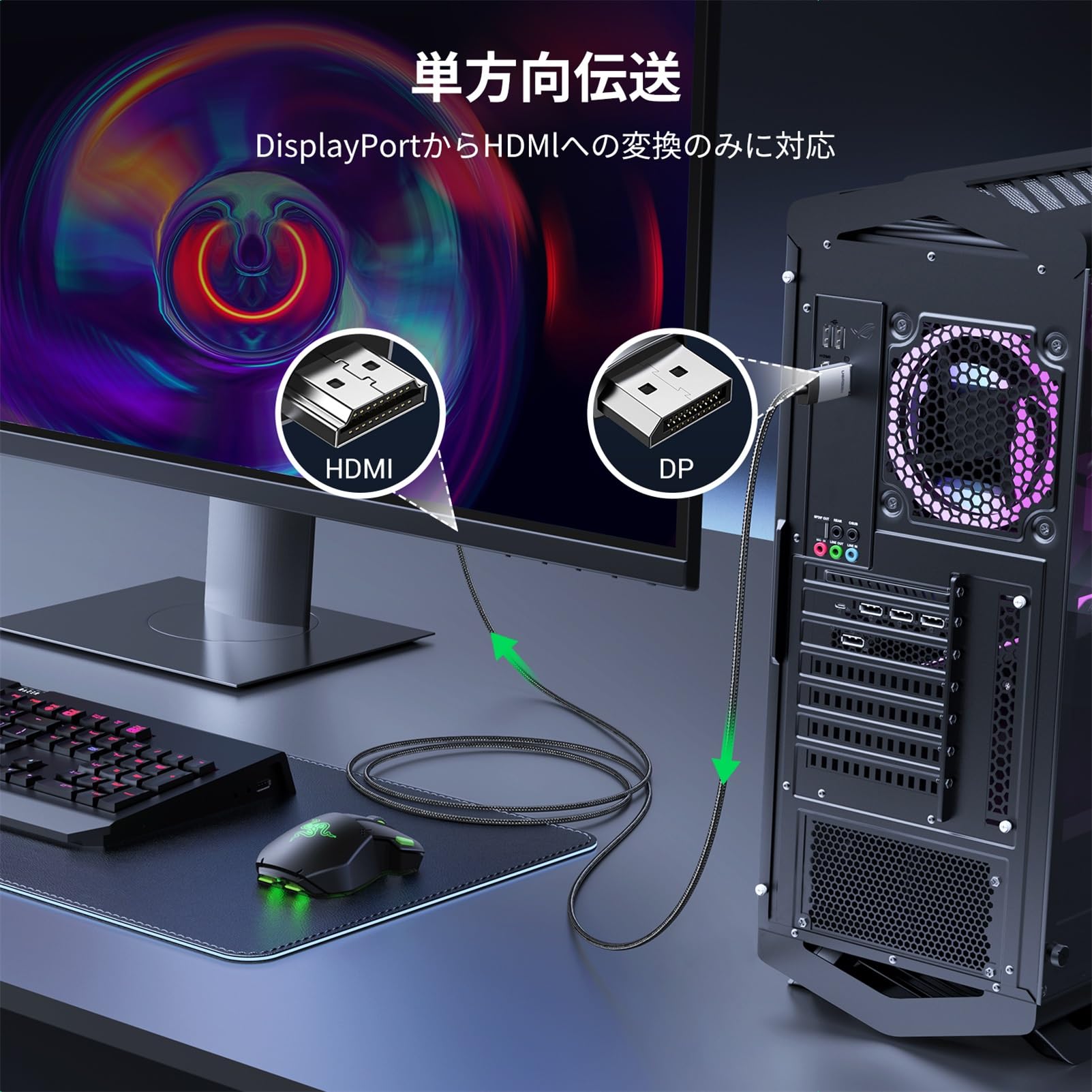 【DisplayPortからHDMIへ簡単接続】DisplayPort(DP、DP++、DisplayPort++)を搭載したノートPCやデスクトップPCと、HDMI入力を備えたモニター、プロジェクター、HDTVを接続できる変換ケーブルです。作業領域の狭いノートPCから外部のディスプレイやテレビを拡張領域として利用したり、Displayportしか利用できない状態のPCからHDMI接続のディスプレイを利用したりできます。ご注意:単方向信号設計のため、HDMIからDisplayPortへの変換には対応しておりません。