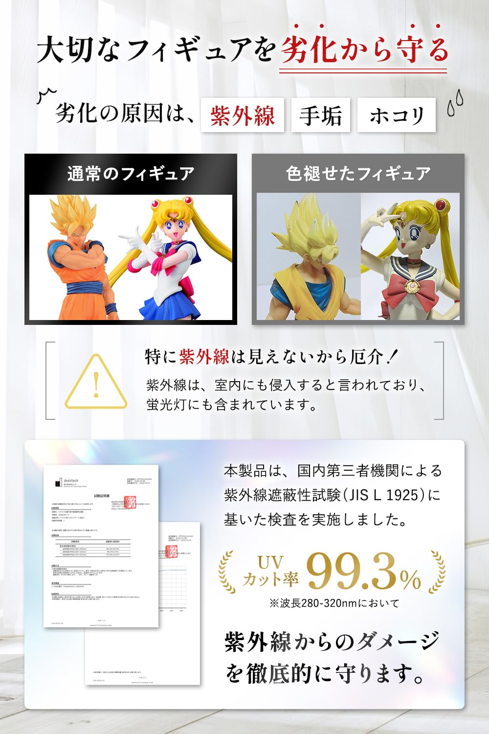 【UVカット率99.3%】(※2023年5月12日 検査実施済)紫外線からのダメージをしっかりガード。国内第三者機関による紫外線遮蔽性試験(JIS L 1925)に基いた検査を実施済みで安心してお使い頂けます。