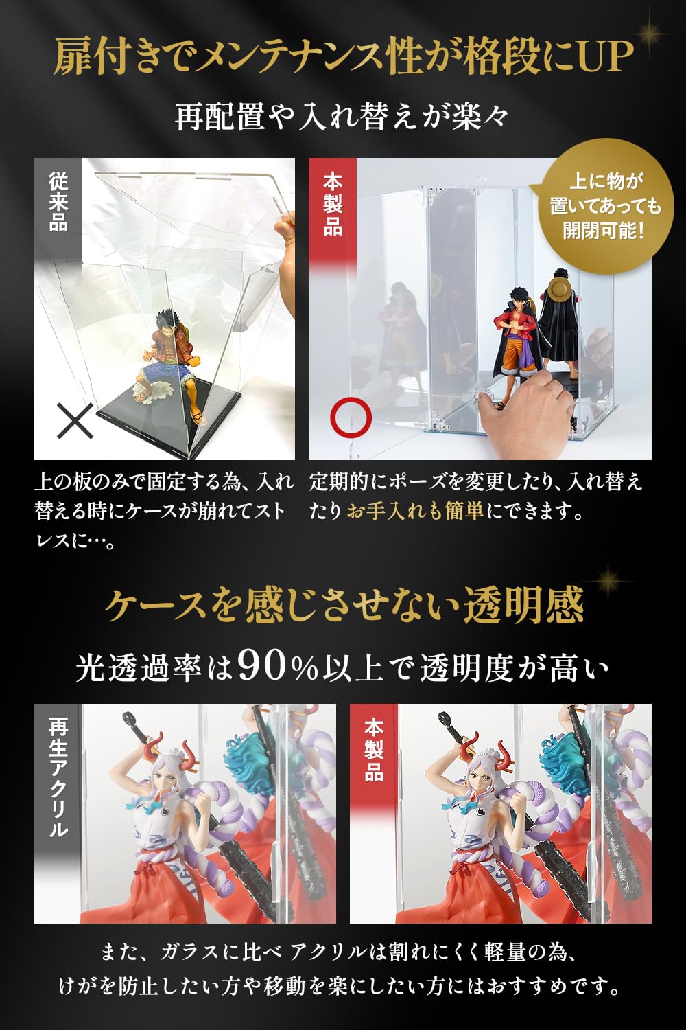 【メンテナンス性UP】マグネット付きの前扉でフィギュアの配置も簡単に変更できます。上に物を置いた状態でも扉が開く。