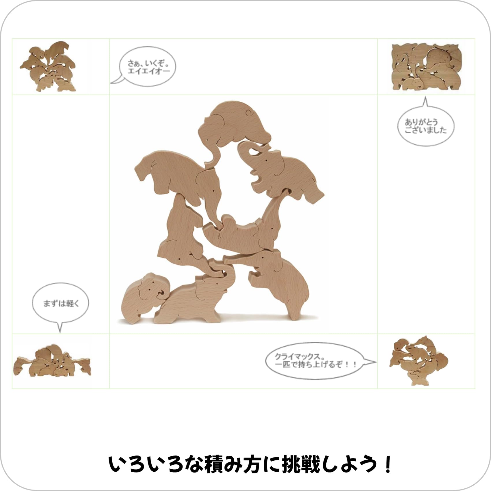 さまざまなポーズの象の積み木が、あなたの想像力の舞台となるバランス積み木です。ピースを組み合わせて積み上げる喜びに浸りながら、驚きのアクロバットな曲芸を生み出しましょう。象たちが無限の可能性を示してくれる、魔法の遊びがここにあります。