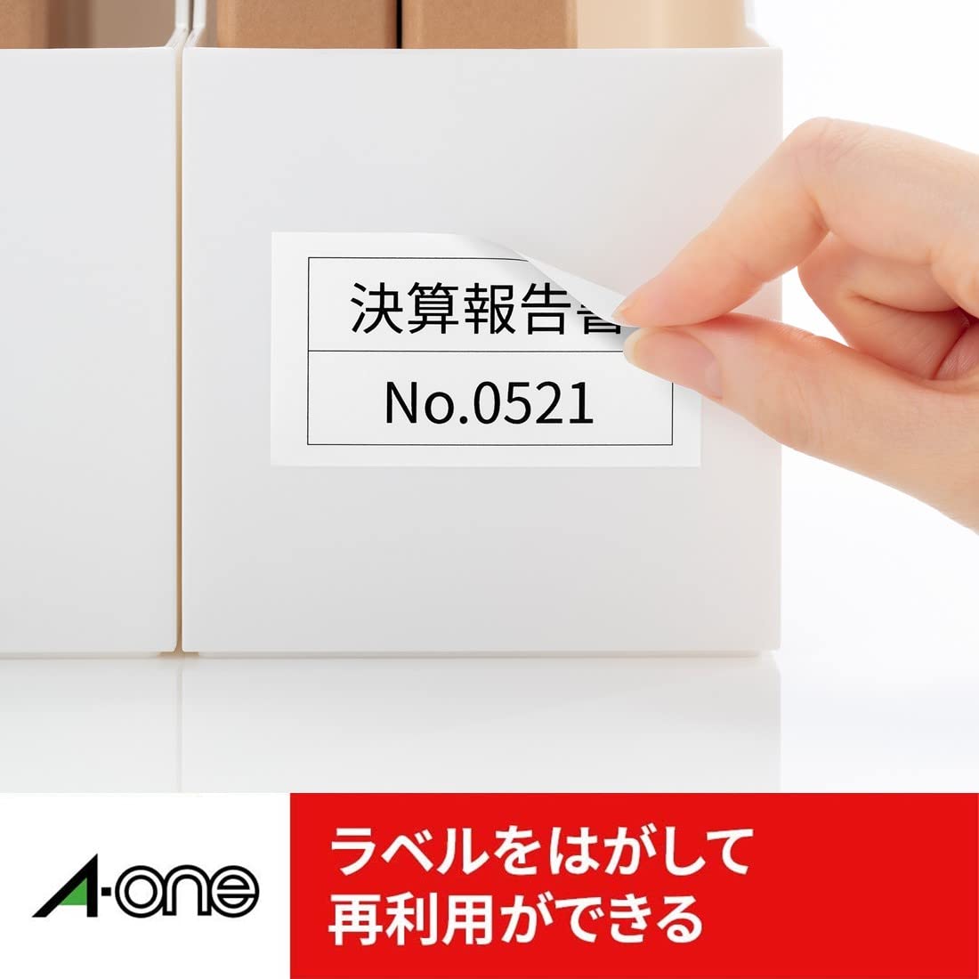 貼っている間はしっかり貼り付き、はがす時は糊残りしない糊を使用しており、きれいにはがせるラベルシール。少量の水気であれば印刷がにじみにくい加工。キレイにはがせるので、一時的な表示、あとで貼り替えをしたい時に最適なラベルシール。ファイルなどのタイトル表示、整理収納時の表示、備品表示などに便利。ファイルや文房具、棚、キャビネットなどに貼っても、あとではがせるので安心。