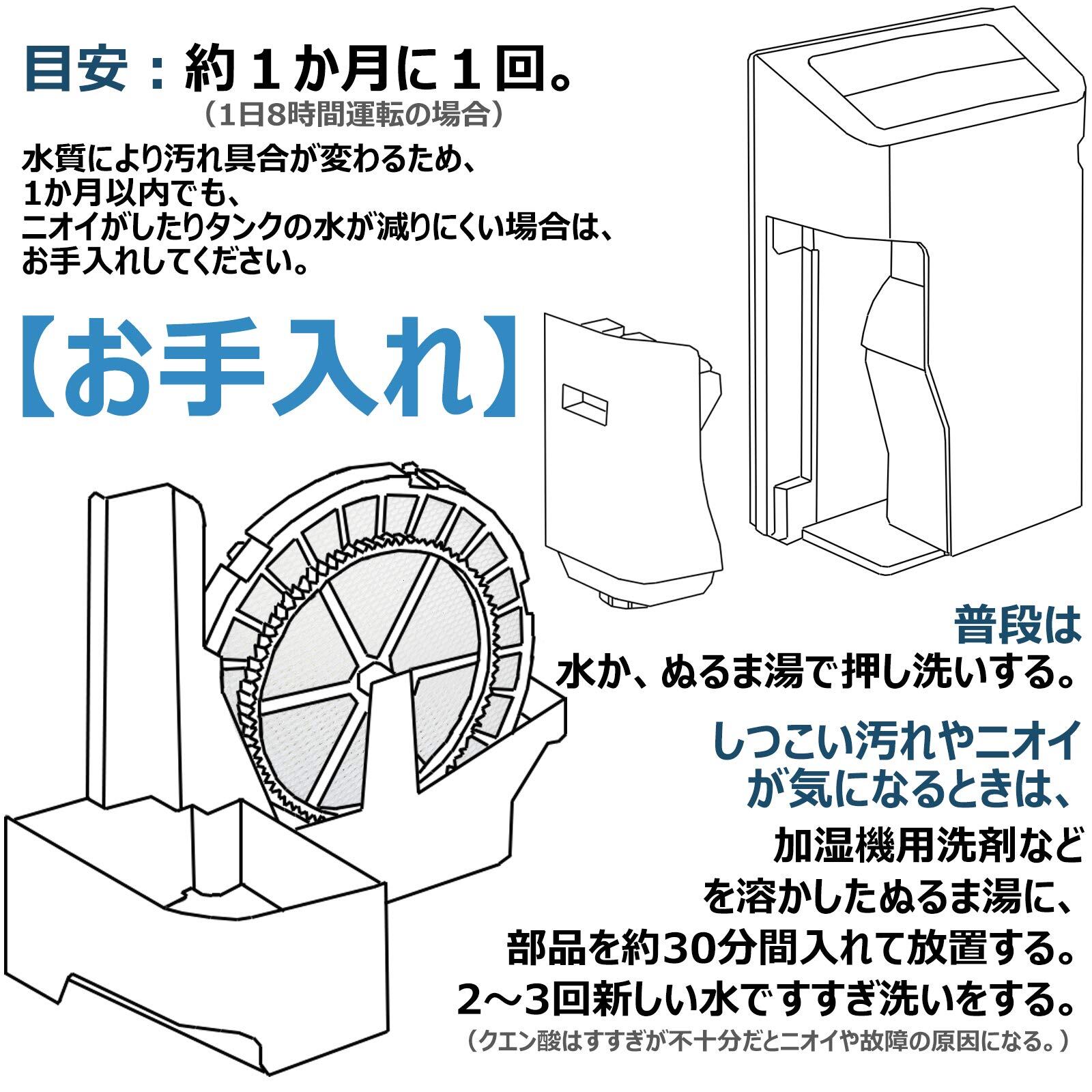 【お手入れ】約1か月に1回。湿フィルターは水か、ぬるま湯で押し洗いする。