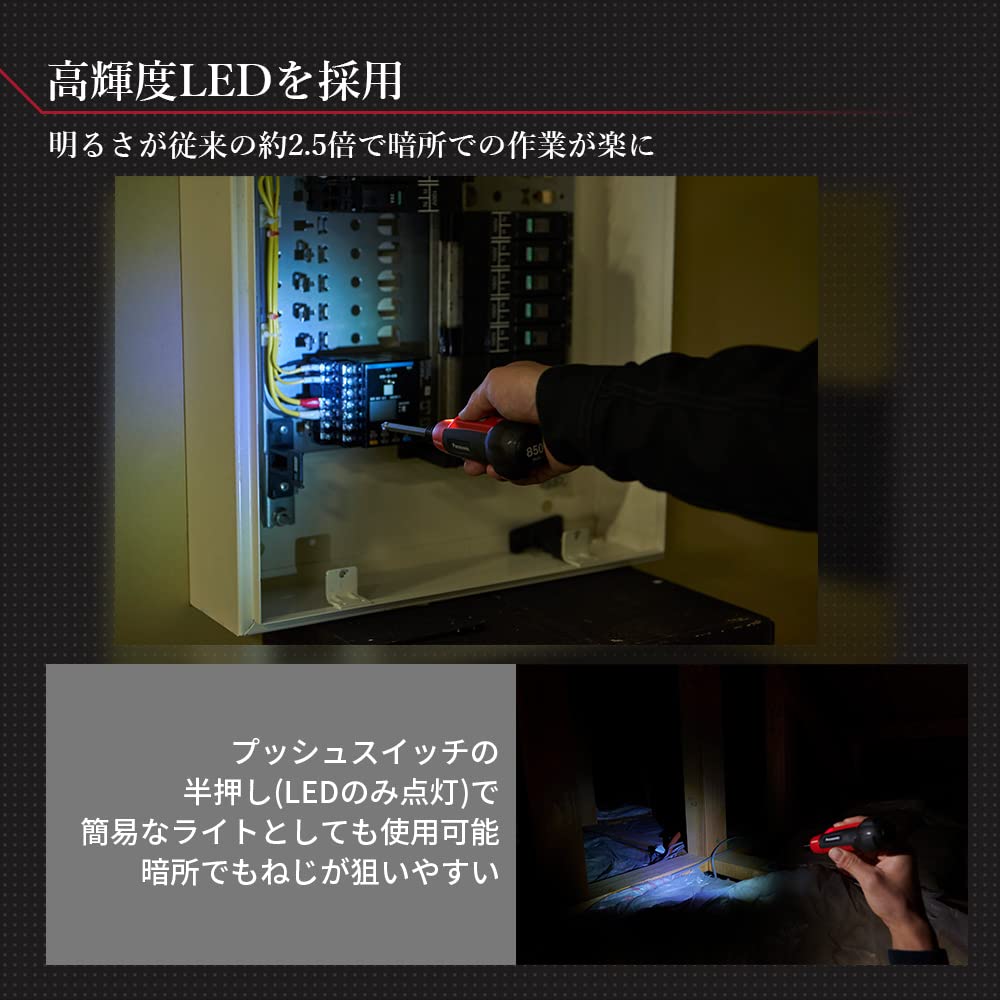 ●プッシュスイッチの半押し(LEDのみ点灯)で、簡易なライトとしても使用可能でき暗所でもねじが狙いやすい仕様です。