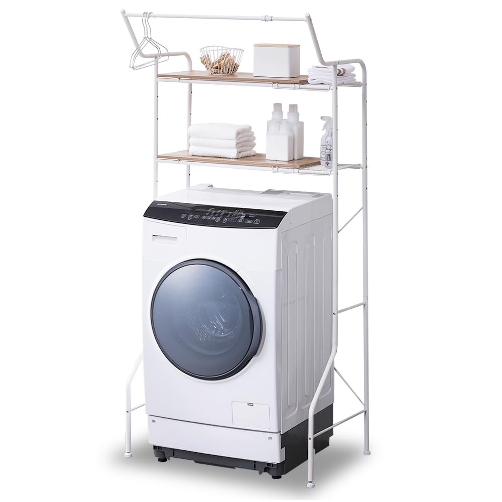 アイリスオーヤマ ランドリーラック 洗濯機ラック ハンガーバー付き幅伸縮タイプ(70~90cm) ホワイト デッドスペースを賢くおしゃれに活用 収納棚 隙間収納 メッシュ棚で伸ばしたときの落下防止 クロスバーでグラつき防止 幅約70~90×奥行約53×高さ約180 HSLR-EX895