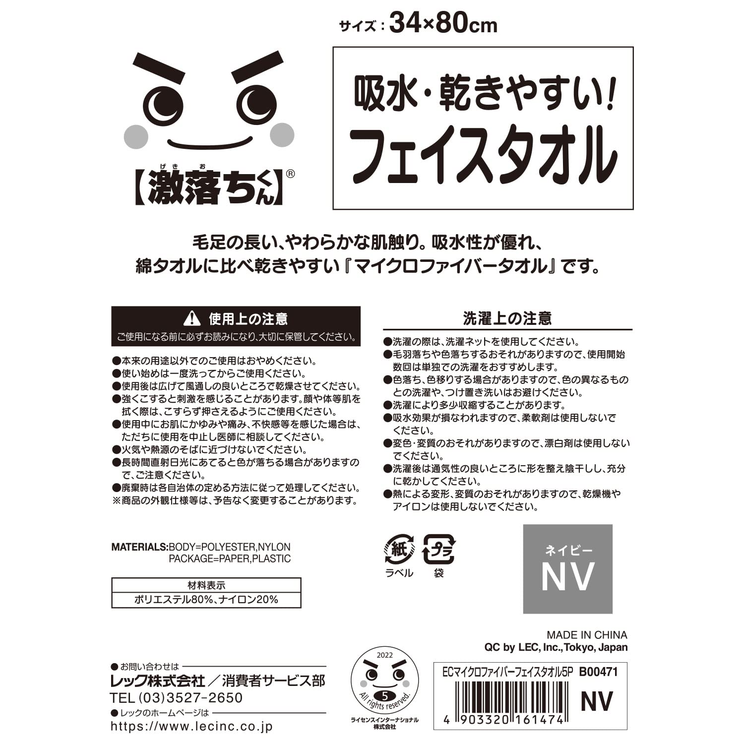 レック(LEC) 激落ちくん マイクロファイバー フェイスタオル 5枚入 (ネイビー) 超極細繊維のやわらかい肌ざわり/高い吸水性/濡れても乾きやすい /