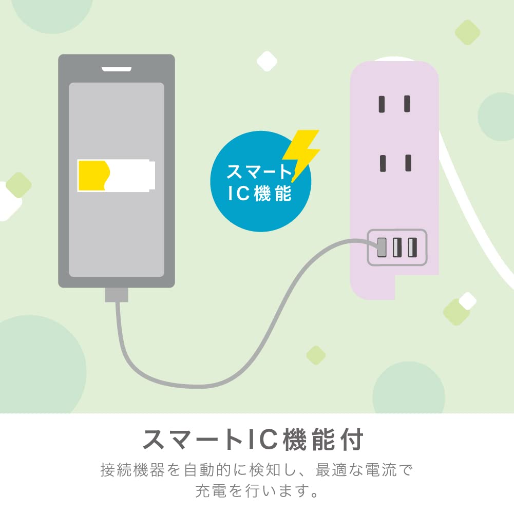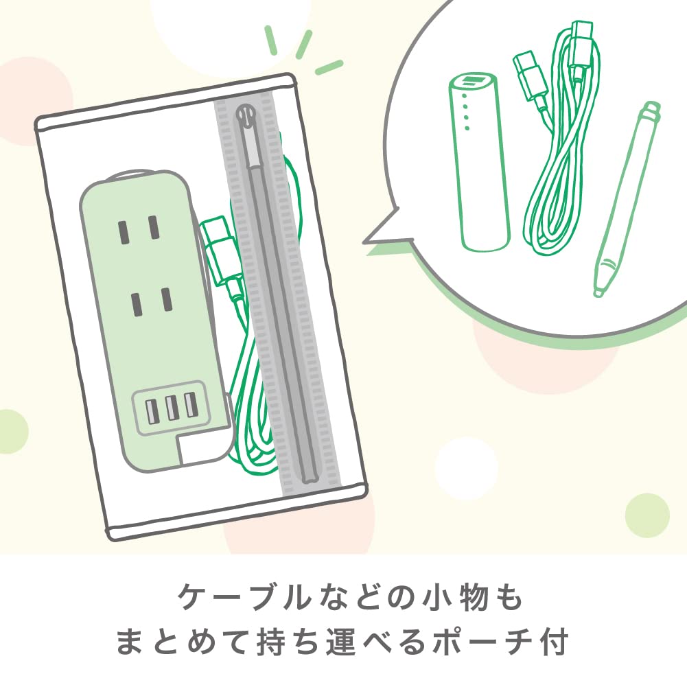3つのUSBポート付+収納できるコードで持ち運び使用にも最適! 従来品より約20%スリム&コンパクトに。ポーチ付なのでケーブル・バッテリーなどの小物もまとめて持ち歩く事ができます。USBは3ポート合計3.4Aの給電能力があり、複数同時充電ができるのでコンセントまわりもスッキリ! ACコンセントは3口(合計1400Wまで)。差込口の間隔を広めにし、アダプター同士が干渉しにくいよう設計しています。スマートIC機能で、接続機器を自動的に検知し、最適な電流で充電を行います。ACプラグの根本に絶縁処理を施した、トラッキング防止プラグを採用。より日常へマッチするカラー展開で、お好みのものをお選びいただけます。商品名:ソニック ポータブルコンセント ユートリムエル スリム ポーチ付 USB-A×3 バイオレット UL-6345-V