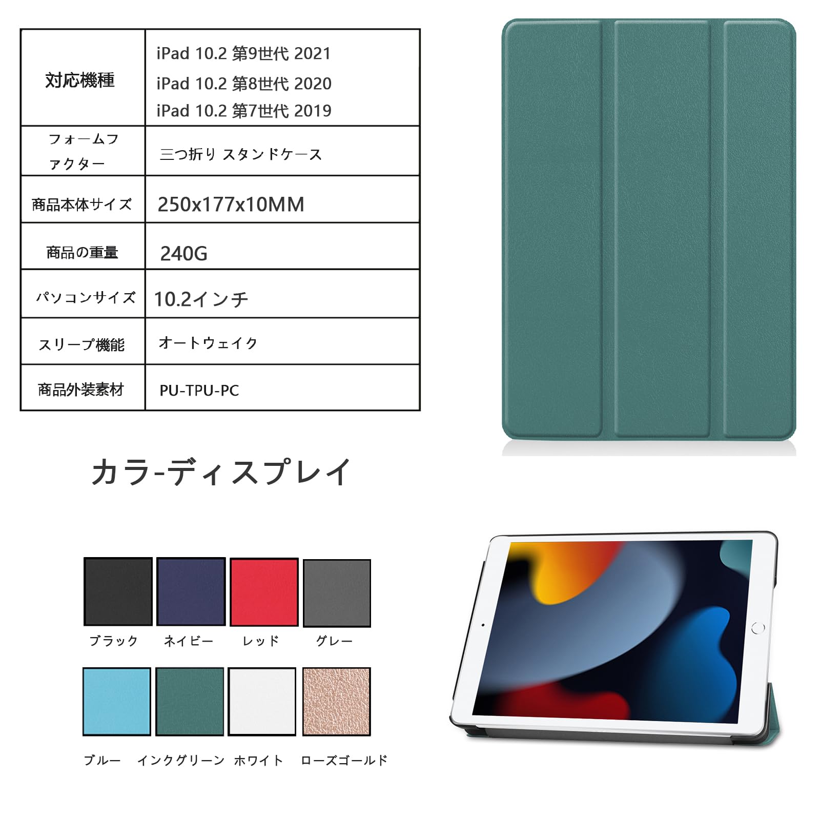 iPad ケース 10.2 第9/8/7世代 (2021/2020/2019年) 通用カバー三つ折り スタンド オートスリープ機能 アイパッド用タブレットケースPU+PC 軽量 傷防止 耐衝撃ipad カバー (グリーン iPad 10.2 第9/8/7世代)