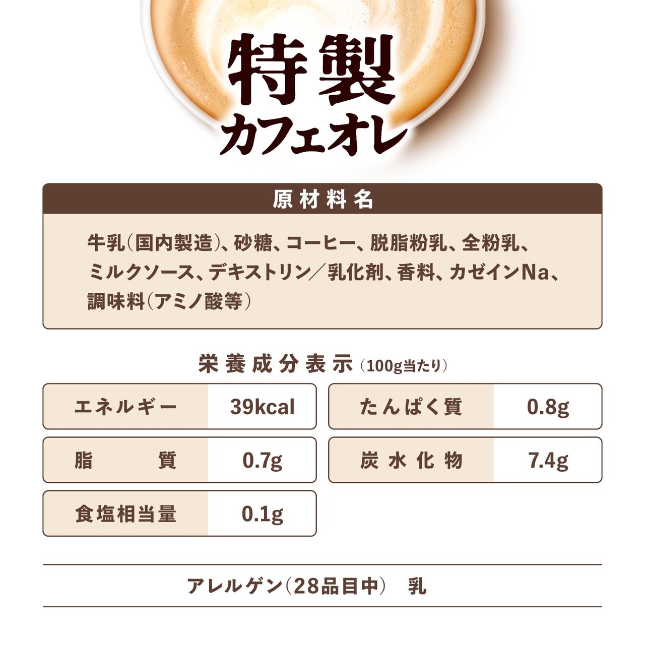 原材料:牛乳、砂糖、コーヒー、脱脂粉乳、全粉乳、ミルクソース、デキストリン、乳化剤、香料、カゼインNa、酸化防止剤(ビタミンC)