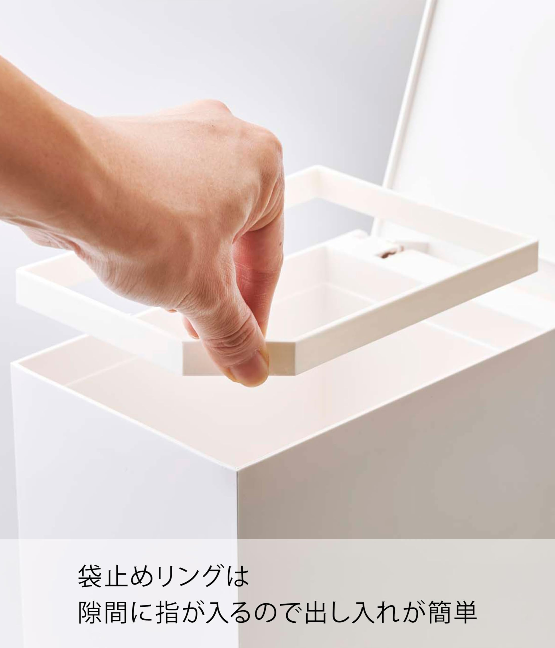 袋をセットする際は、ペダルを踏まずに蓋だけを開くと90度以上開きます。指が入って出し入れが簡単な袋止めリング。
