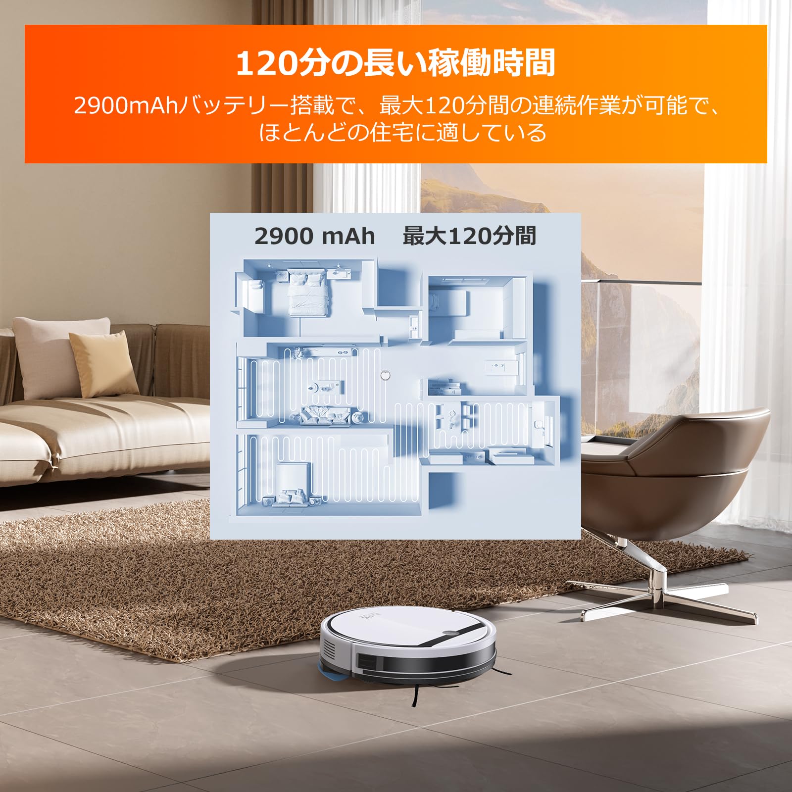 【最大3000Paの強力吸引】高性能のブランレスモーターにより、最大3000Pa強い吸引力を実現しています。同価格の他社製ロボット掃除機のほとんどは、吸引力が2000paしかありません。2900mAhのバッテリーを搭載し、最大120分間の連続作業が可能です。強力な吸引力で、お部屋のゴミ、毛、微細なホコリまでしっかり吸い込みます。毎日の面倒な床掃除はロボットが代わりに行います。