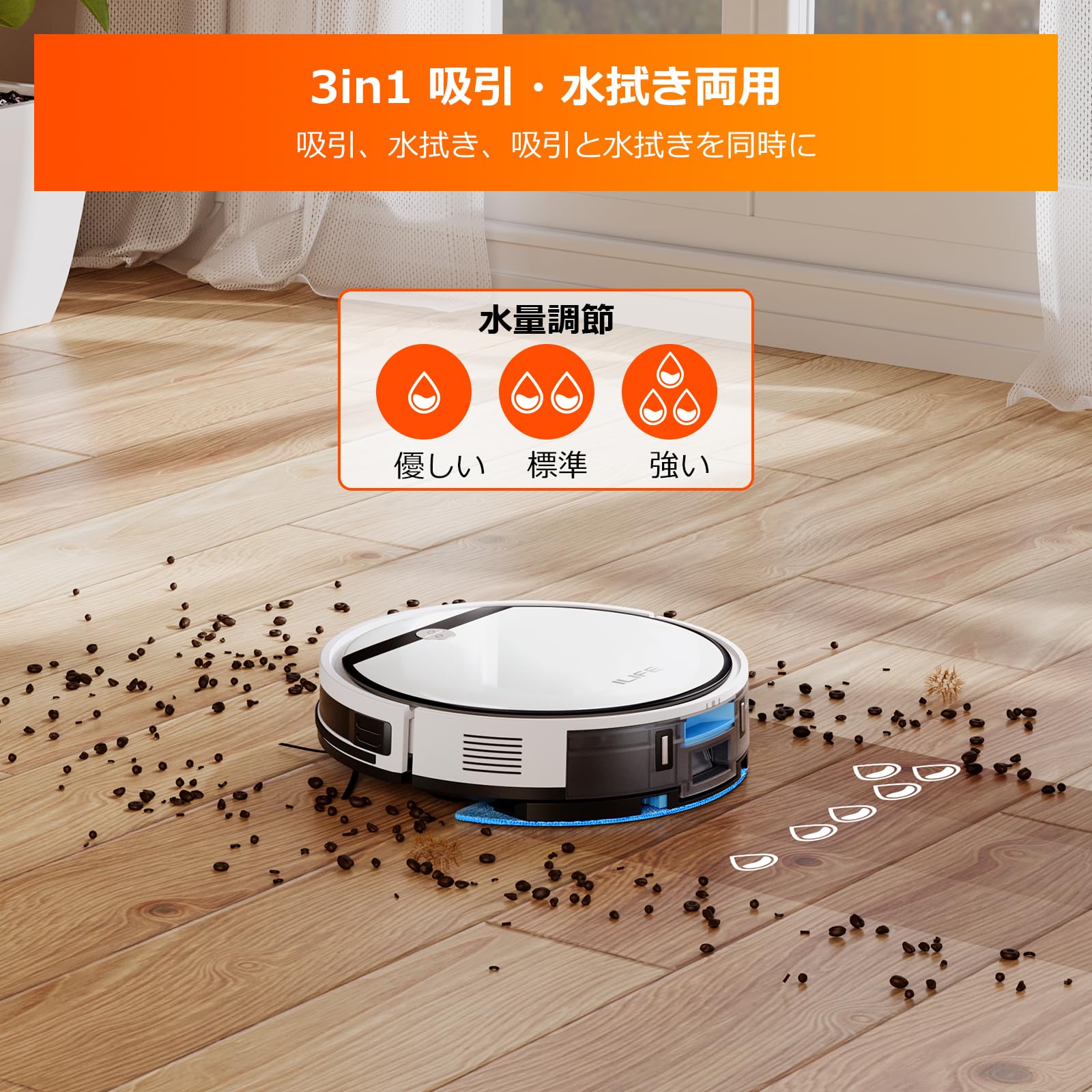 【1台で吸引と水拭きを同時に】一台二役、通常吸引と水拭き掃除は同時に行うことができます。掃除ロボットは、水拭きの水量は3段階で調整可能、環境や目的に合わせてお使い分けいただけます。