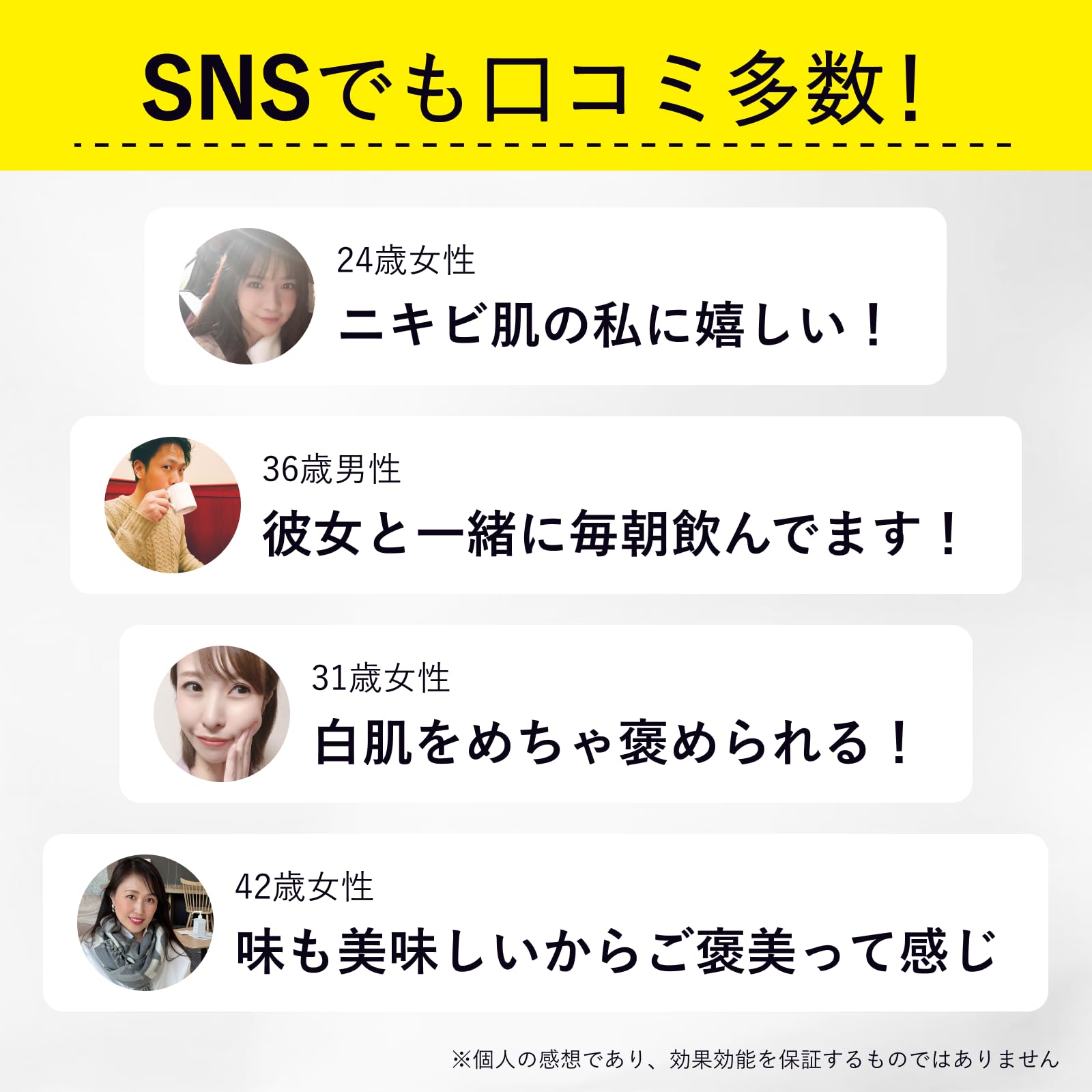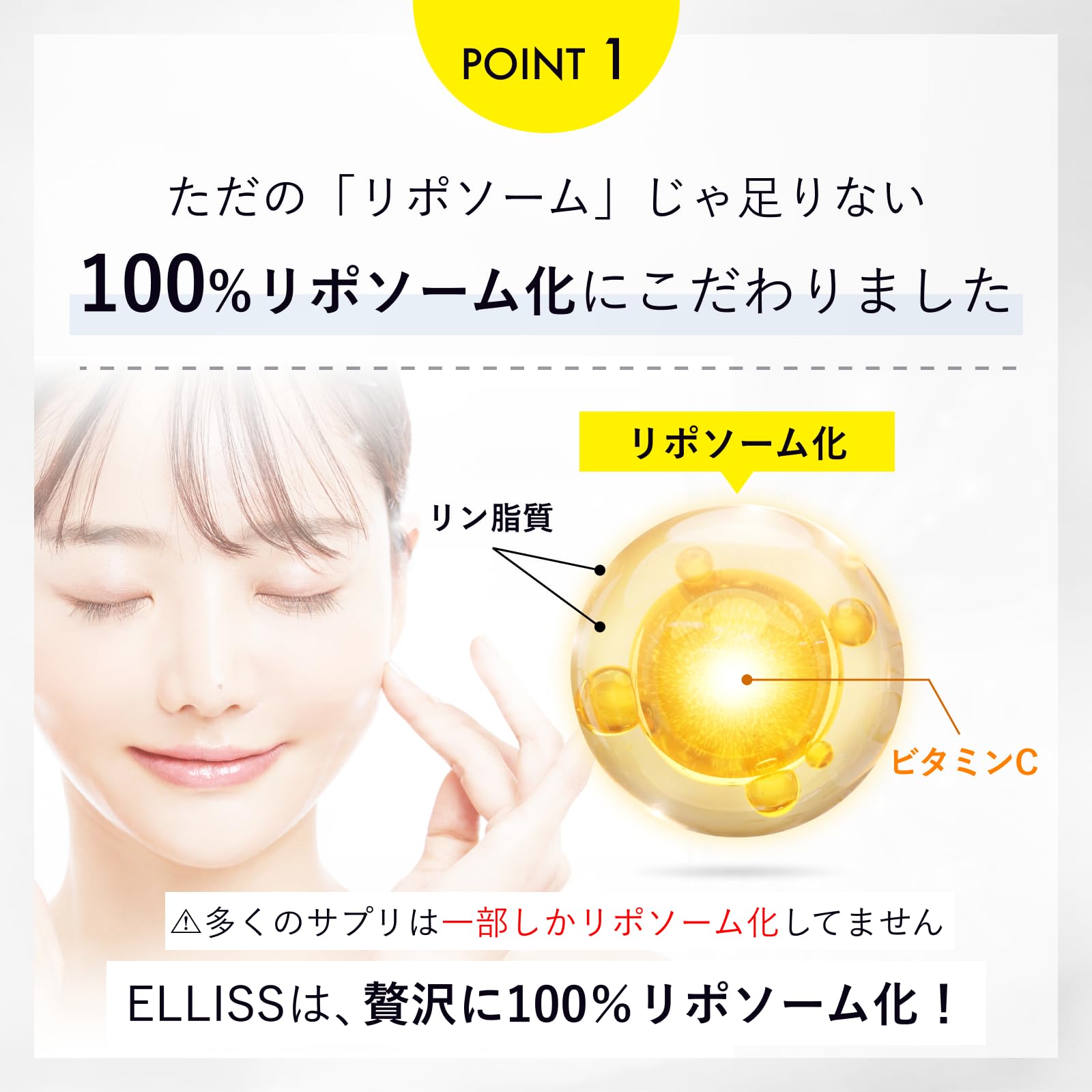 【飲む美容点滴】と最近話題のリポソームビタミンCを1000mg配合しております。市場ではリポソームと記載があるもののリポソームを一部に対してのみ実施しているだけの商材が多い中、エルリスでは100%リポソーム化にこだわりました。吸収しやすいリポソーム化された高濃度ビタミンCで、さっぱりレモン風味で手軽に美味しく飲み続けやすいです。