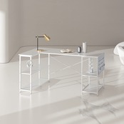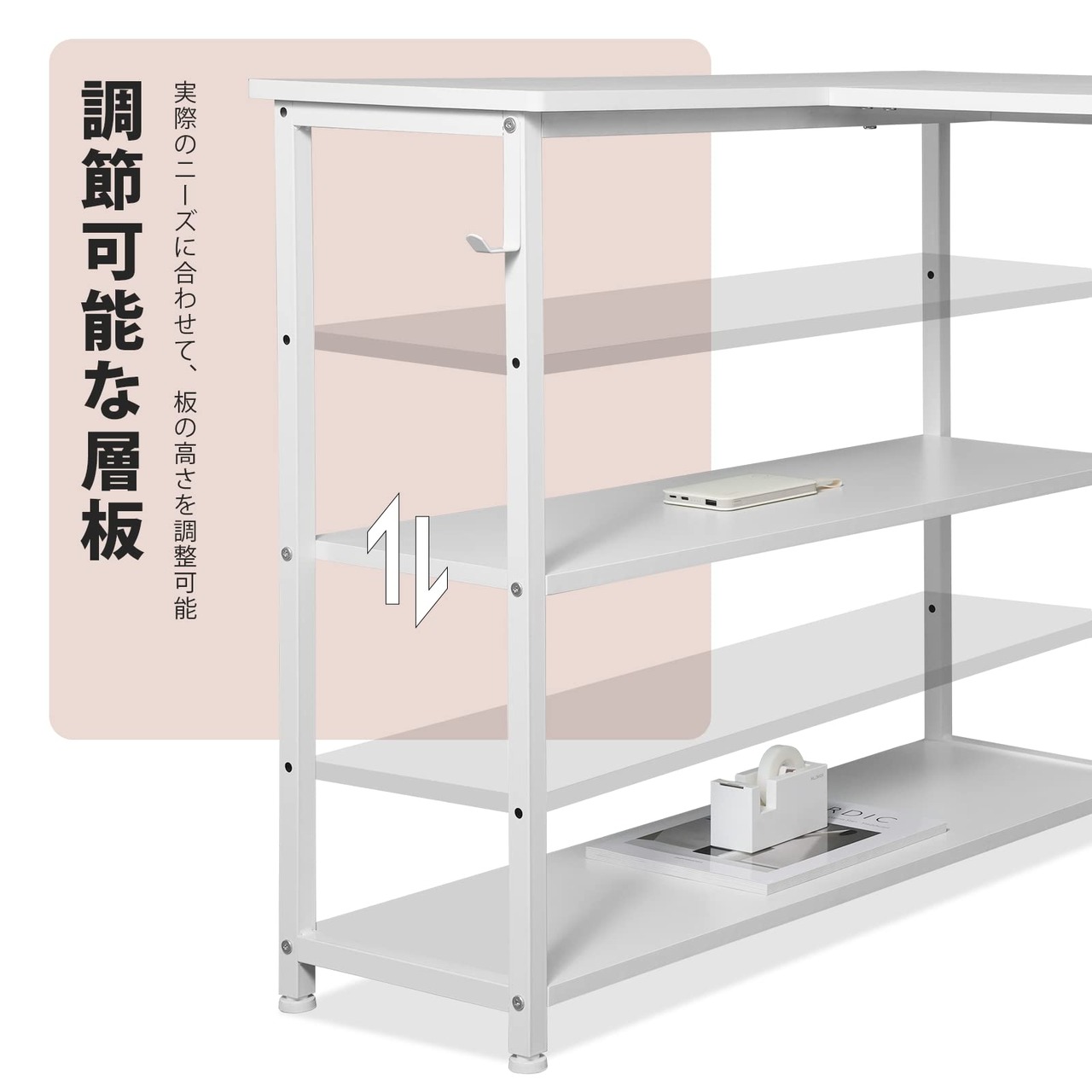 【十分な収納スペース】広い天板と足元がオープンスペースなので移動もスムーズです。他の小さなサイズのテーブルと比べて、反対側に調節可能な層板収納が追加されています。開放感ある収納袋付き、デスクワークをサポートします。L型棚は中間板の高さを調節できるので、必要に応じて書類の高さを変えることができます。