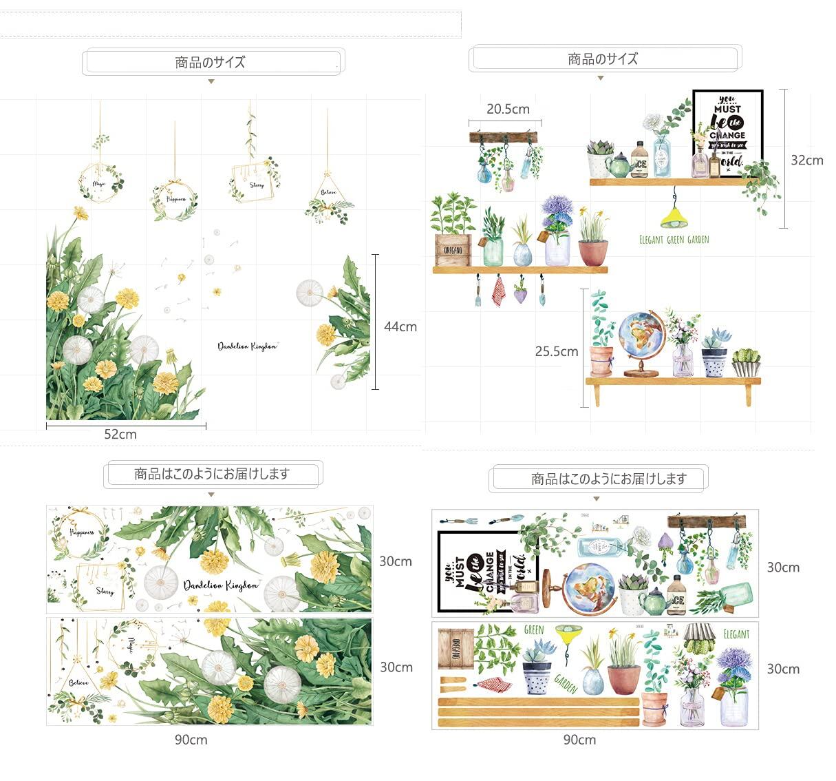 パッケージ内容:30x90cmのウォールステッカー4枚セットです。完成図の大きさは写真をご参照下さい。お好みによって自由に組み合わせしてください。
